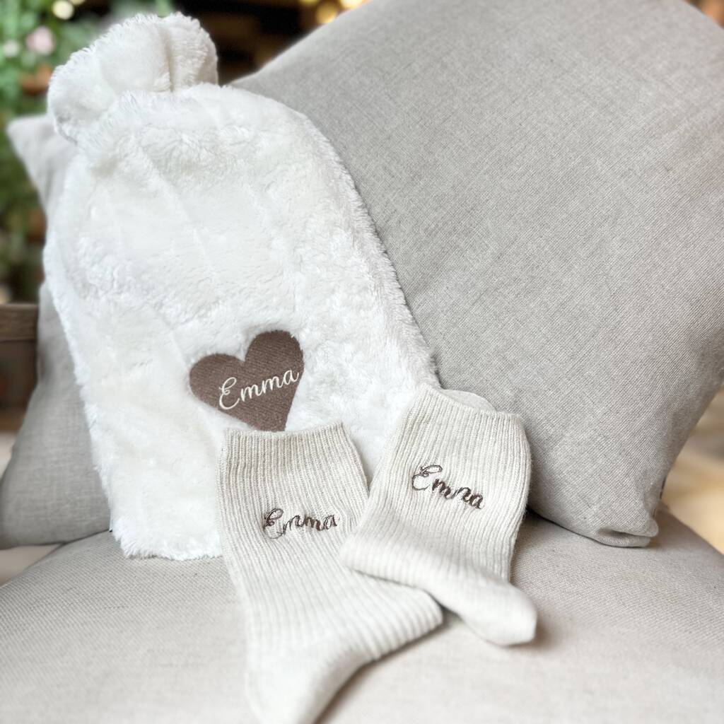 Keep someone cosy this winter with our personalised Winter Warmer Gift Set, featuring a fluffy white hot water bottle and matching cashmere socks, each embroidered with the name of your choice in taupe brown thread.