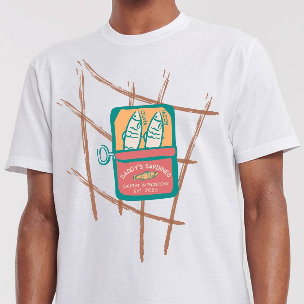 Personalised sardine tin t-shirt with kids' names – a fun Father’s Day gift for dads who pack in love, laughs and little ones.