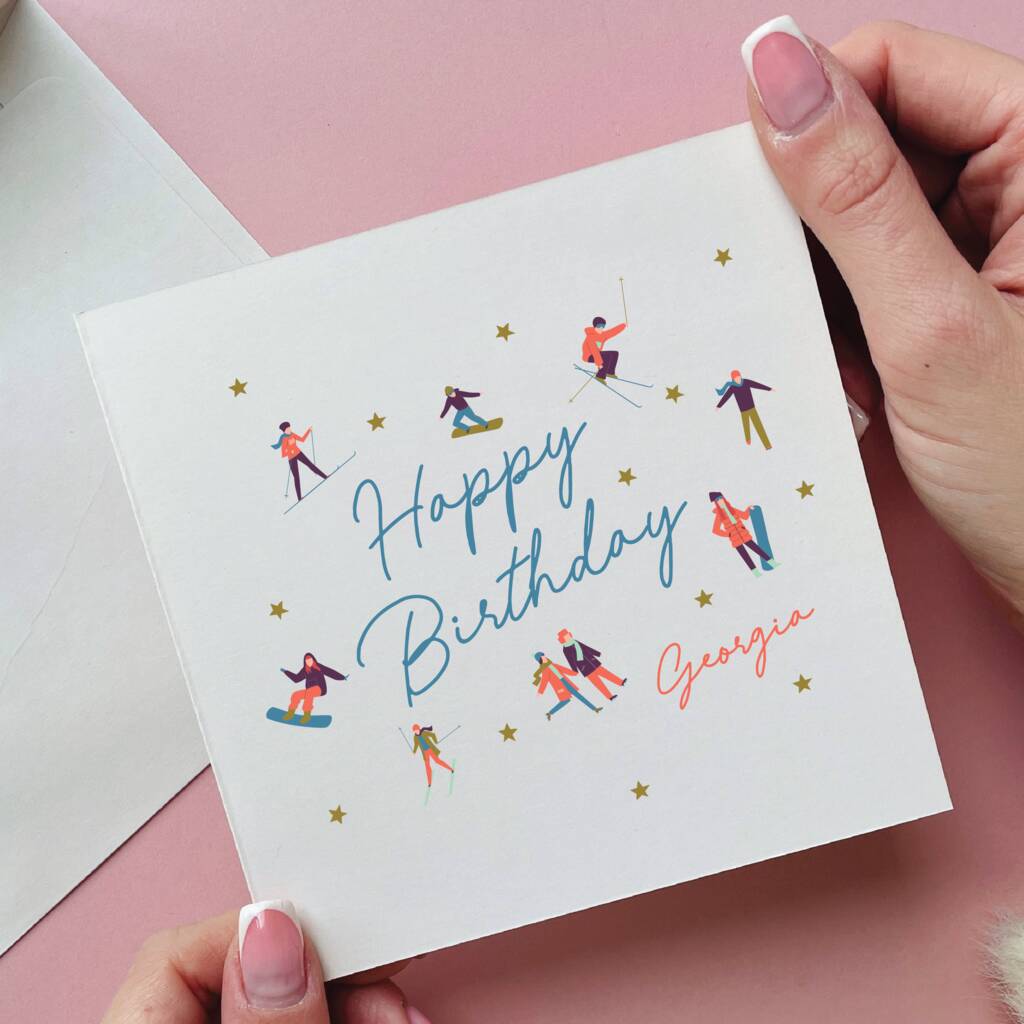 Personalised Mountain People Skiing Birthday Card