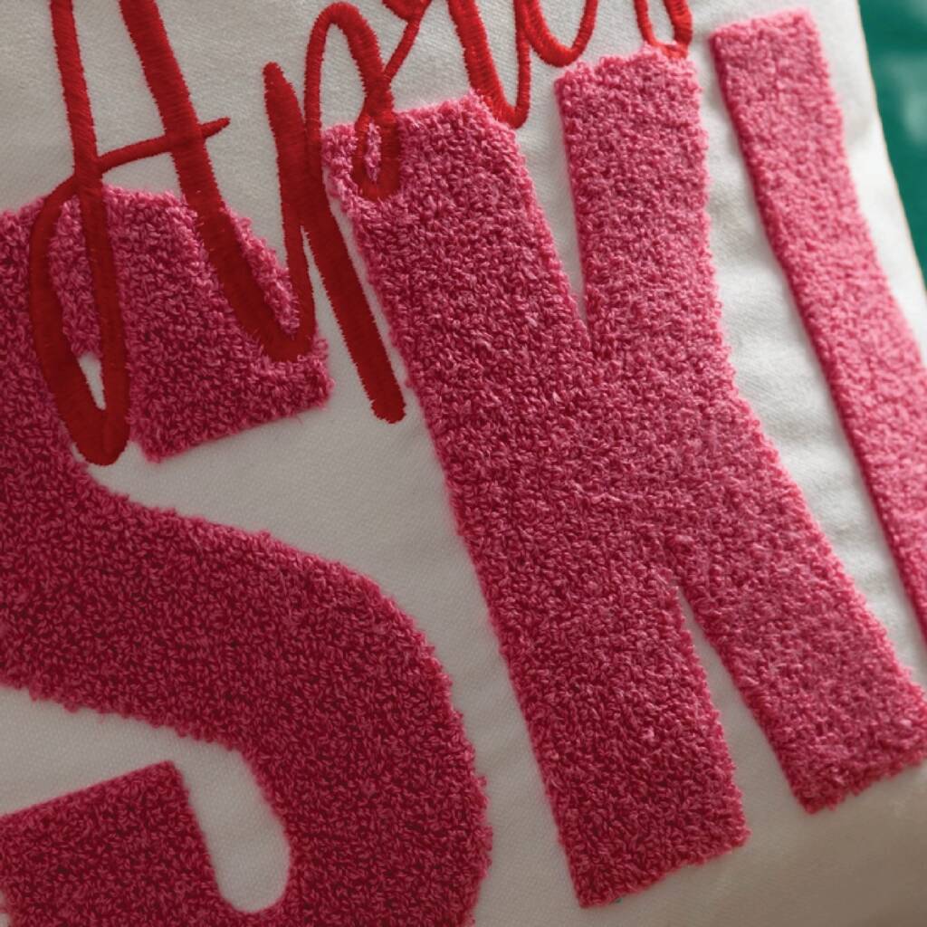 A fun Après Ski cushion with red embroidered script and bold pink tufted lettering, personalised on the reverse with your chosen name or message.