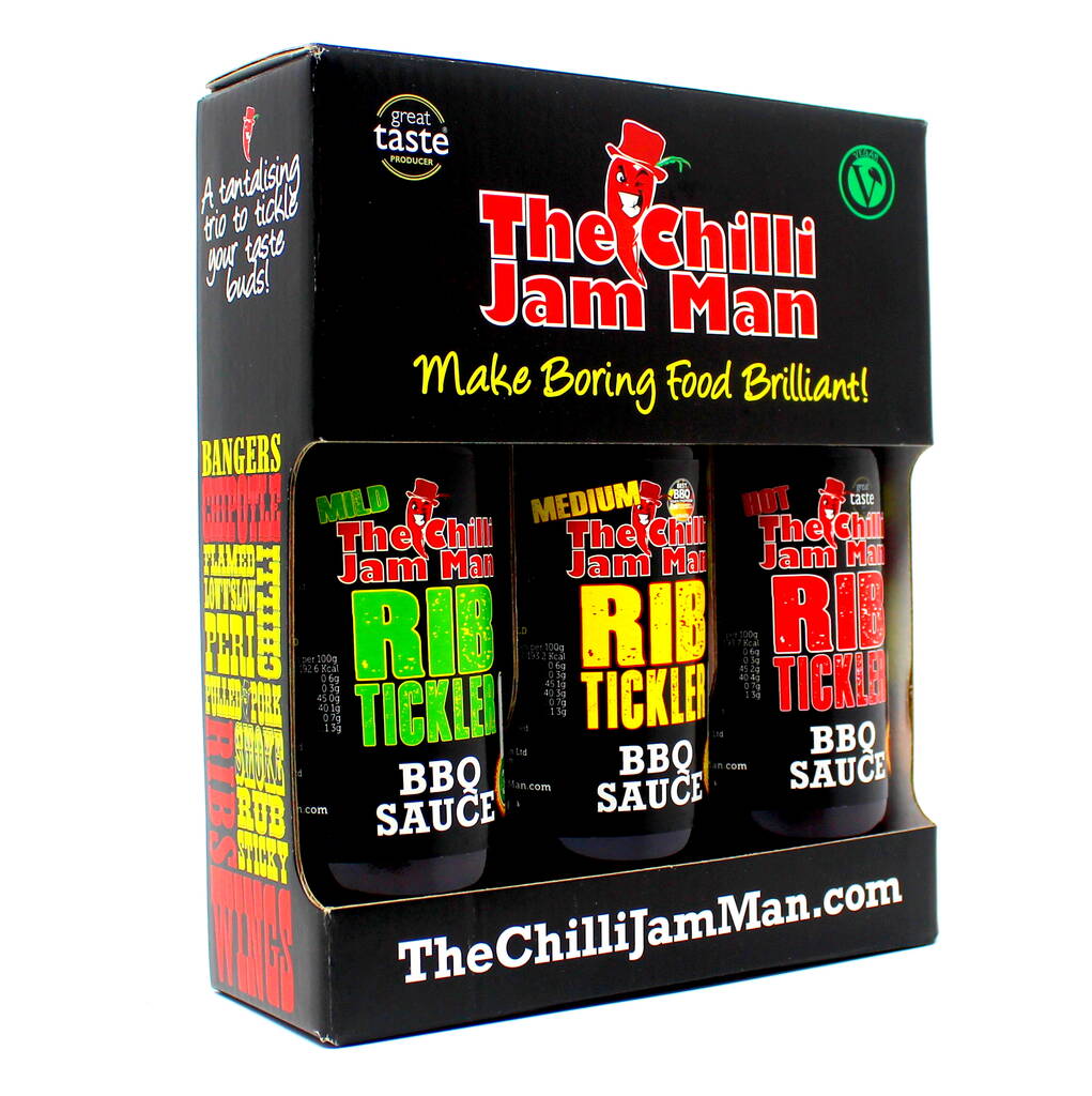 Rib Tickler BBQ Sauce - Ingredients: Mango chutney (sugar syrup, mango, salt, ginger, chilli, garlic, acidity regulator E260), water, chilli jam (tomato, sugar, garlic, red wine vinegar, ginger, chilli, balsamic vinegar, chipotle), sugar, red wine vinegar, tomato puree, dark soy sauce (water, salt, soybeans (SOYA), wheatflour (WHEAT)), tapioca starch.