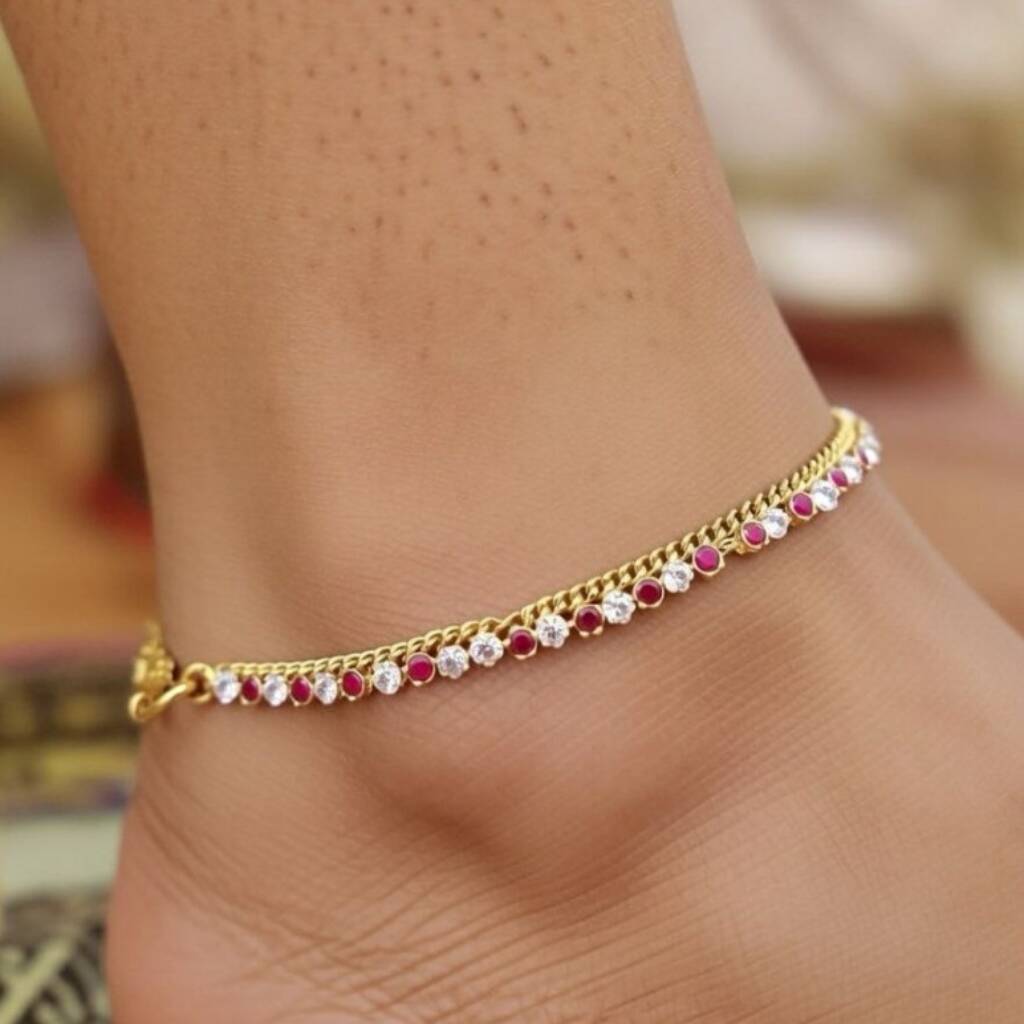 Gold Plated Red And Crystal Stone Chain Payal Anklet
