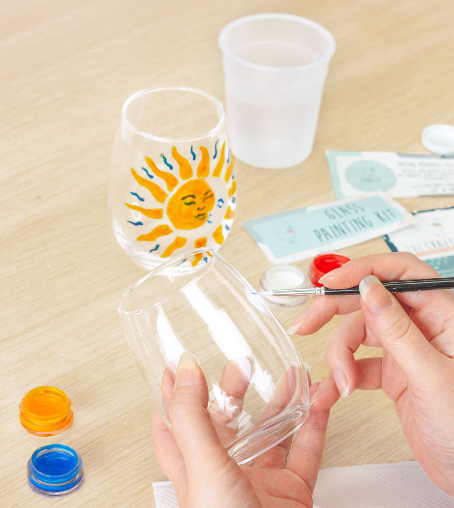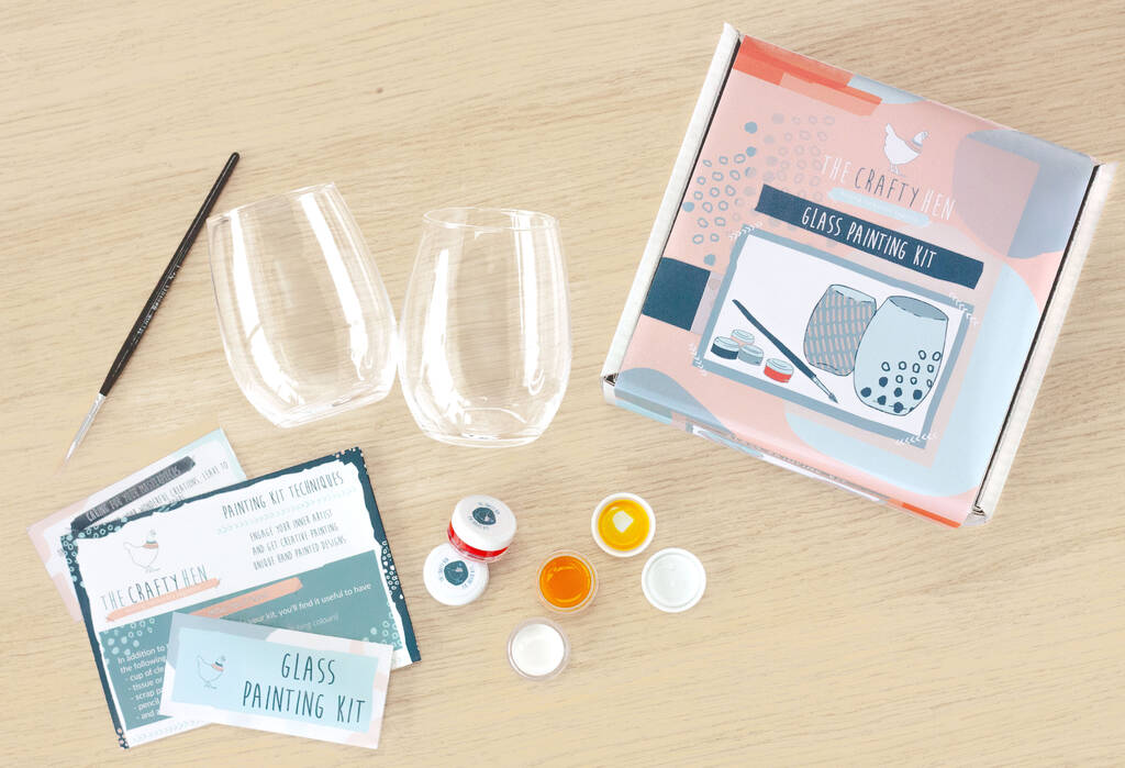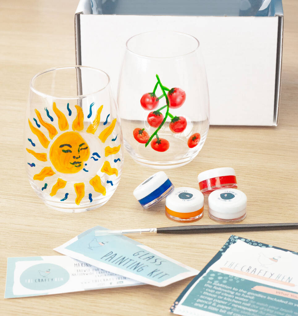 Personalise two glasses with this glass painting kit. Brighten up your day as you sip your favourite drink from your customised glass.Design and hand paint a unique pair of glasses at home. This crafty painting kit is great to give as a creative gift, enjoyed as a cosy date night activity, or to get arty with at home yourself.