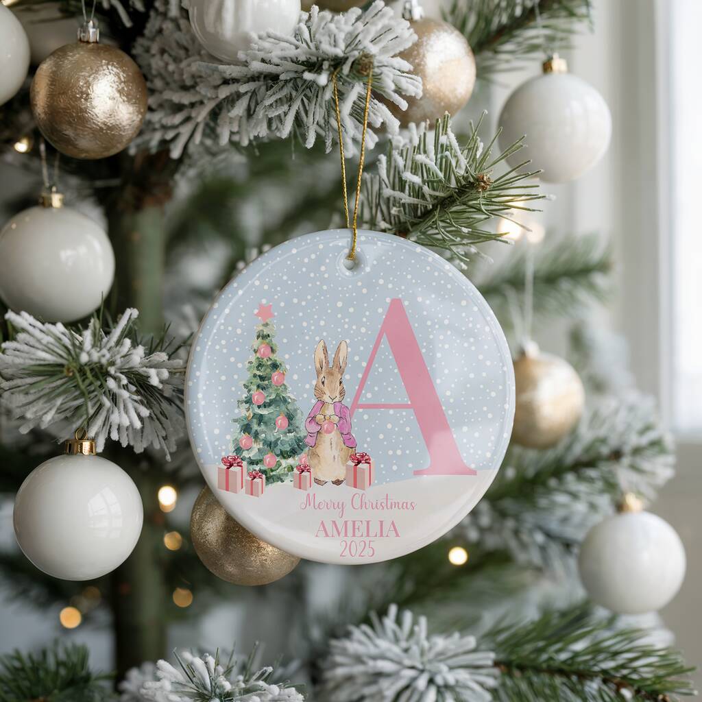 A charming keepsake for baby girls — this personalised ceramic Christmas bauble features her initial, name and year, creating a timeless decoration to treasure.Celebrate a little one’s first Christmas with this beautifully illustrated ceramic ornament from The Design Parlour. Each bauble features your chosen initial, name and year in soft festive colours with a sweet bunny and Christmas tree design — perfect for hanging on the family tree or gifting to new parents and grandparents. Handmade to order in our UK studio, it arrives beautifully finished with a gold hanging cord and organza gift bag. A thoughtful keepsake that will be cherished year after year.