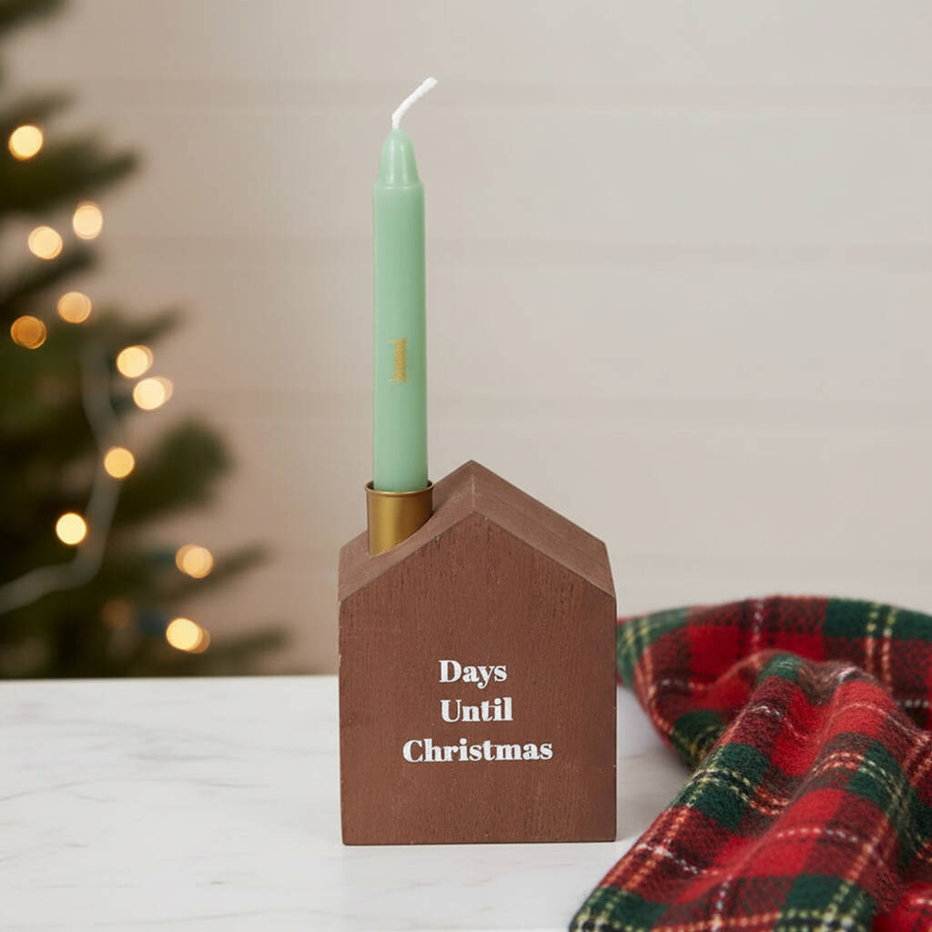 The front of the candle holder reads 'days until Christmas' and each mini candle has a number from 1 to 24 on it. You can count down the days to Christmas by burning the candle of the corresponding number of days left until Christmas day.