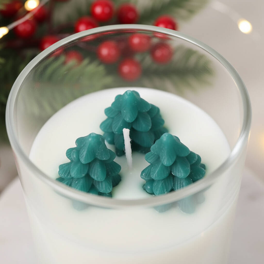 Our unscented Christmas candle makes a lovely traditional Christmas decor candle and features 3 green Christmas trees in a glass jar candle. Perfect Christmas gift!