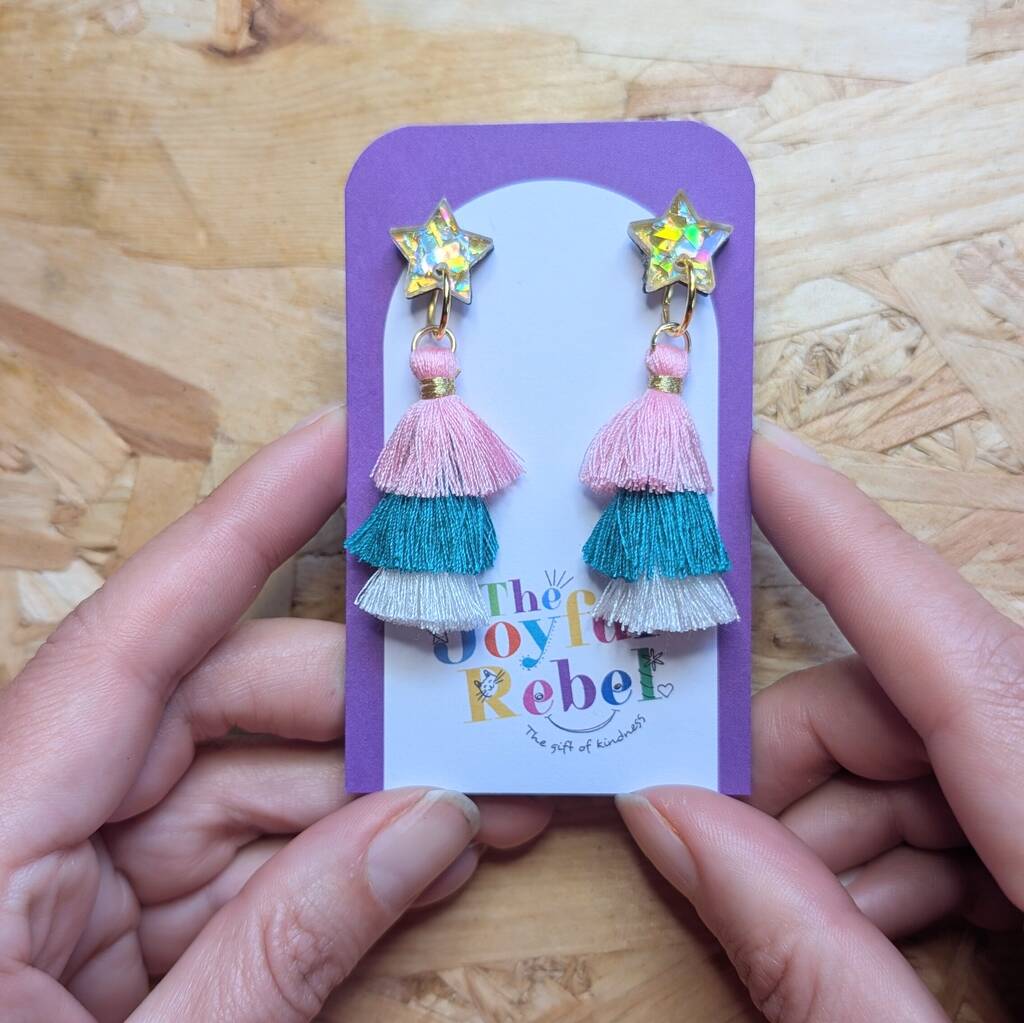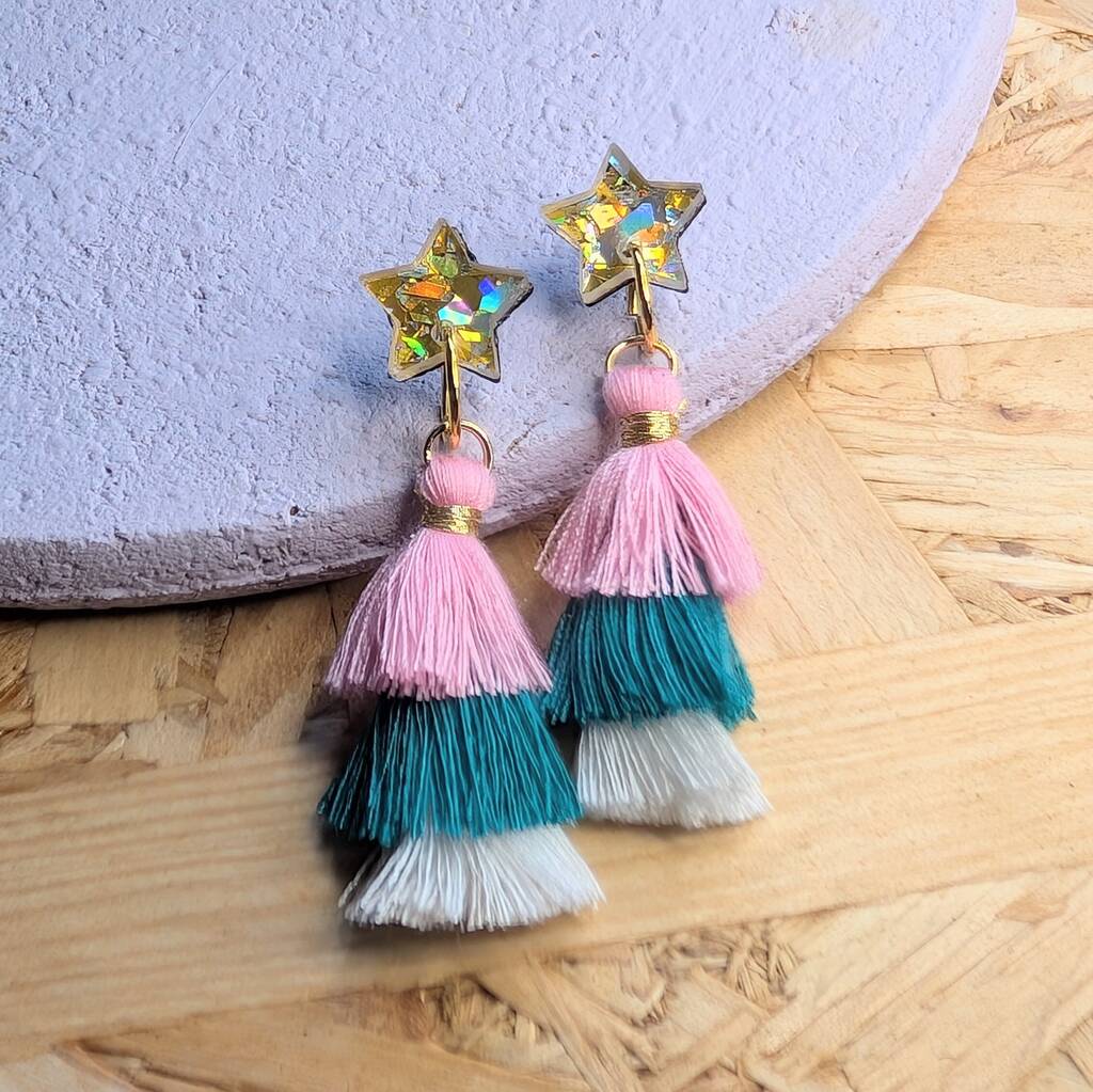Green Tassel Dangly Christmas Star Earrings, 1 of 4
