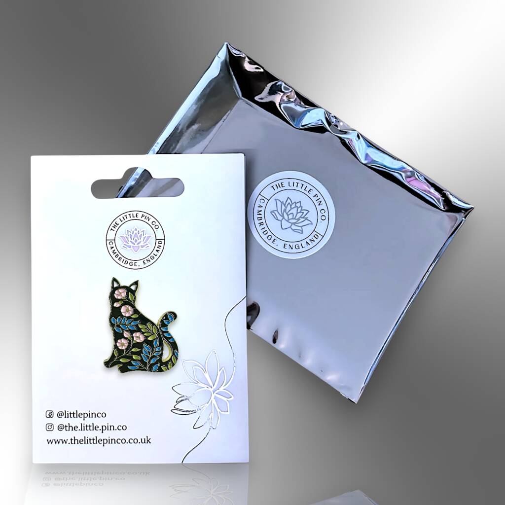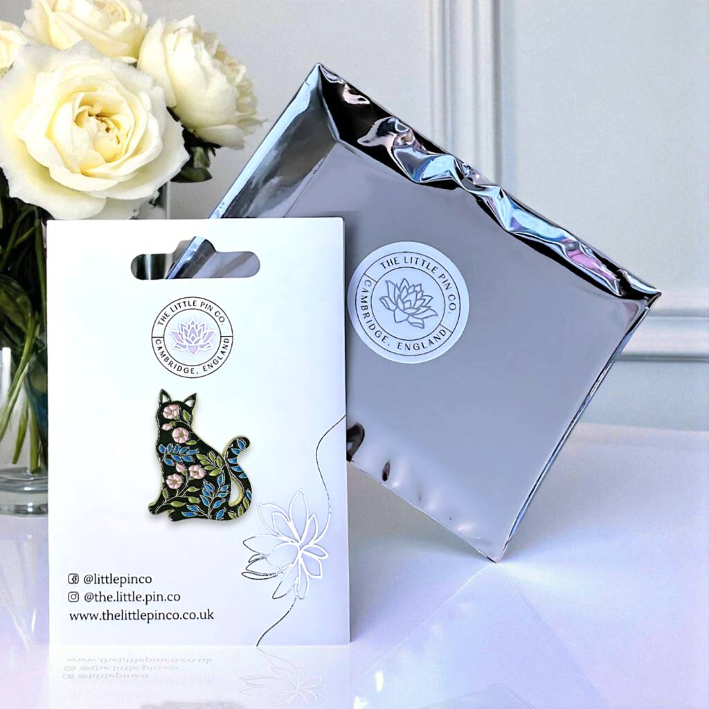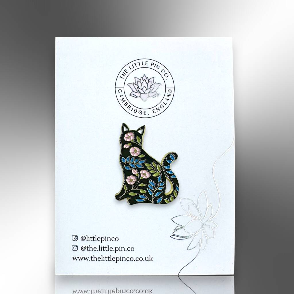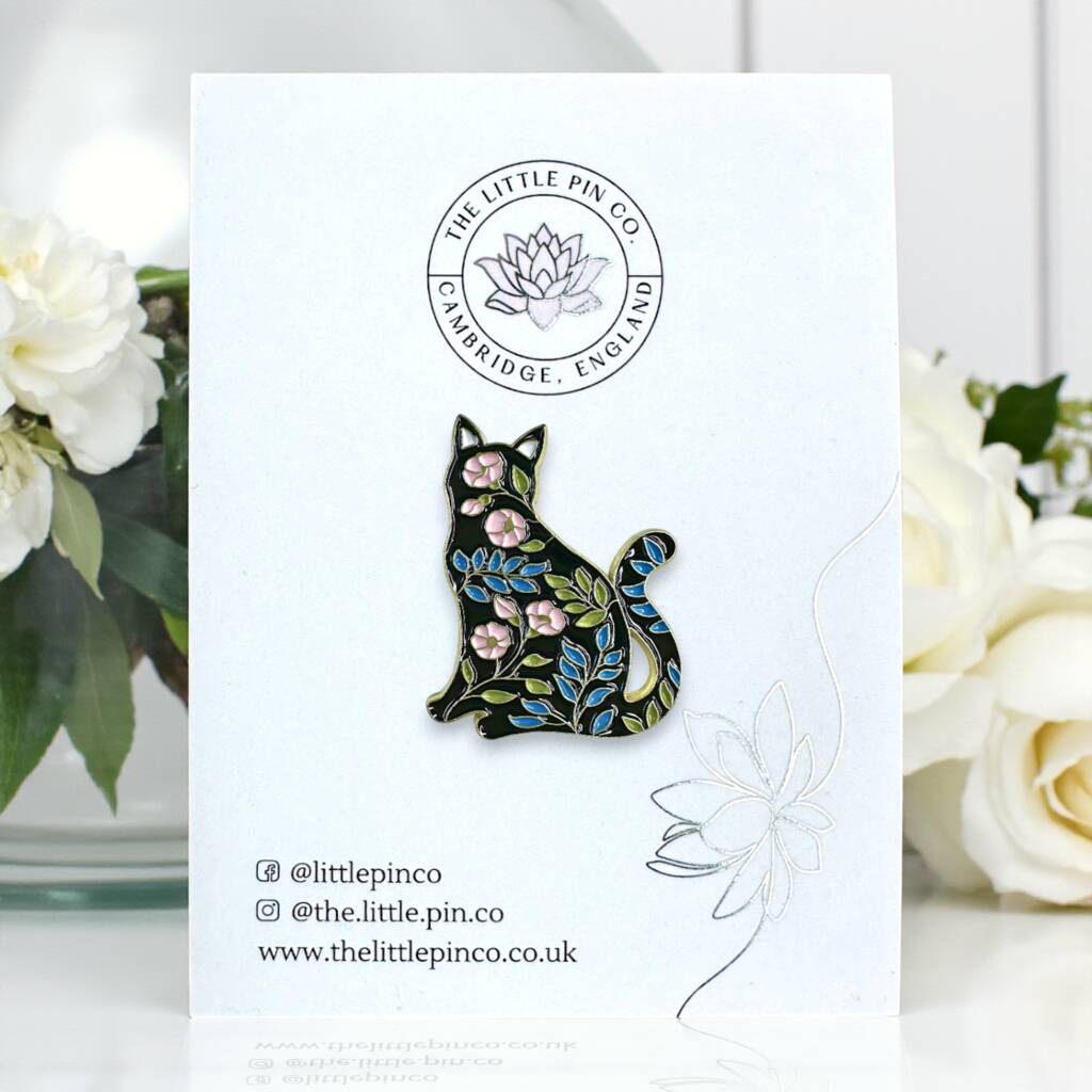 Floral Black Cat Enamel Pin Badge, Friendship Jewellery Gift, Botanical Cat Brooch, Unusual Gift