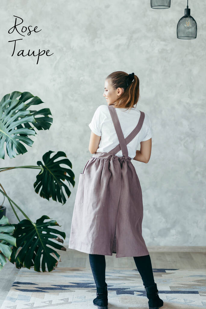 Handmade linen dress apron for makers, artists and studio work. A comfortable crossback pinafore with pockets, available in timeless linen colours and optional personalised embroidery
