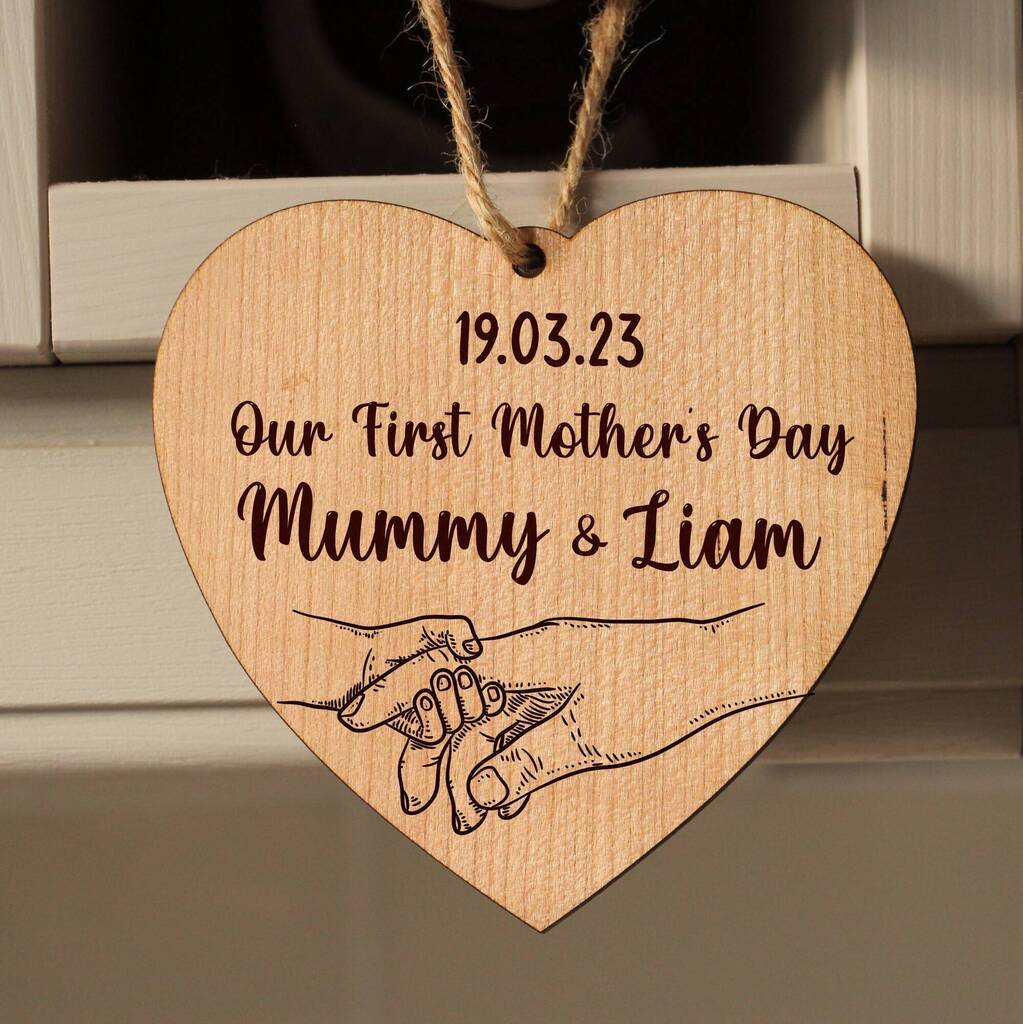 A personalised ‘Our First Mother’s Day’ cherry wood heart with twine, engraved with baby’s name and date—a keepsake gift for a new mum.