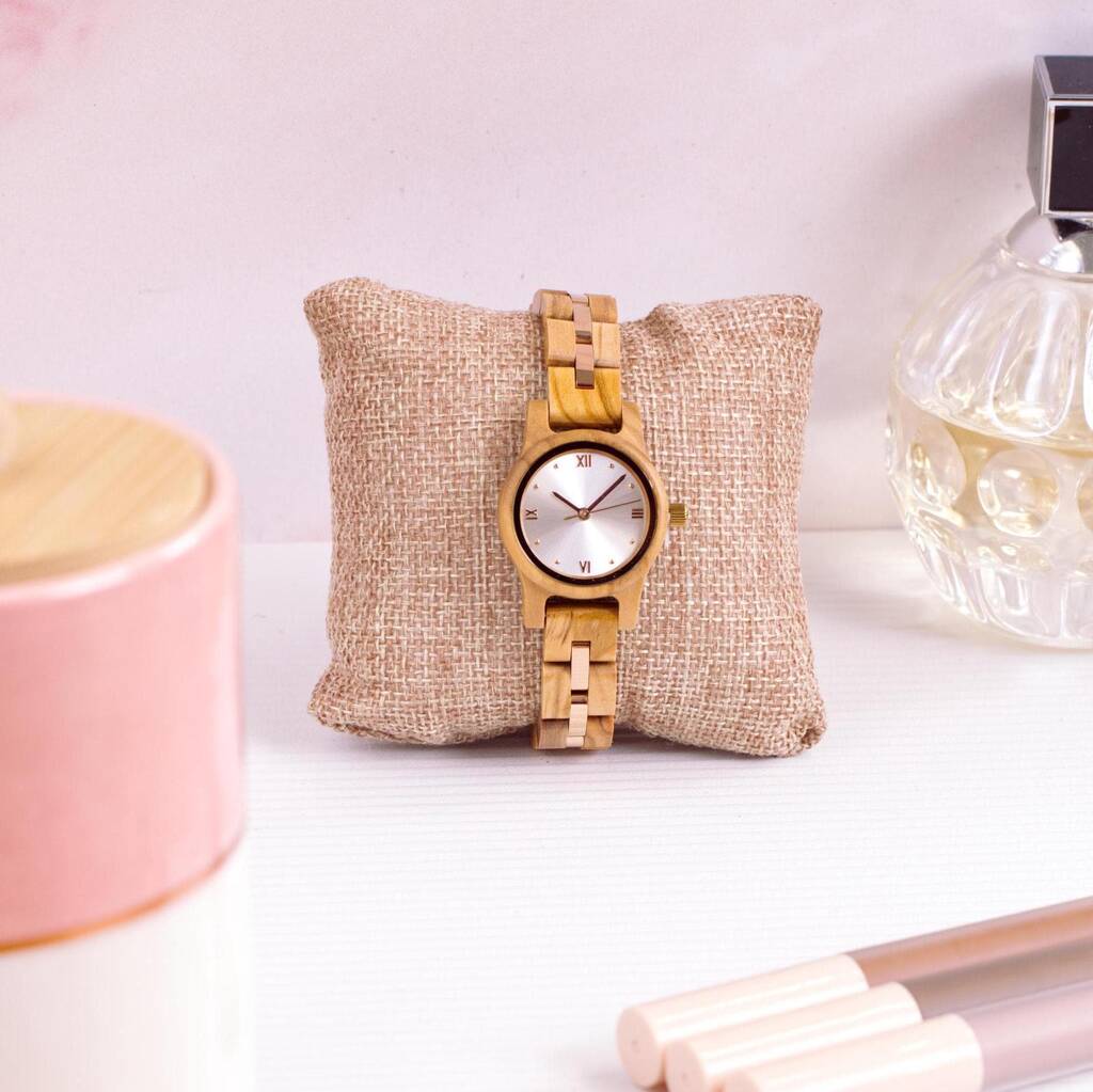 The Seville is a slim olive wood watch with a silver dial and rose gold accents, personalised with engraving – a gift-ready watch for her.