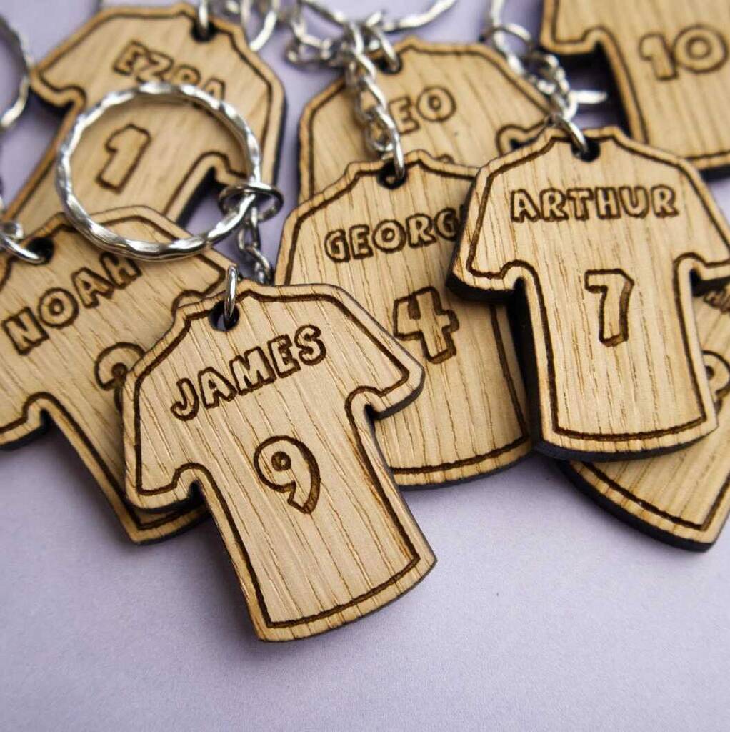 Personalised Football Shirt Keyring With Engraved Names And Numbers — Perfect For Kids' Party Favours, Team Gifts Or Stocking Fillers
