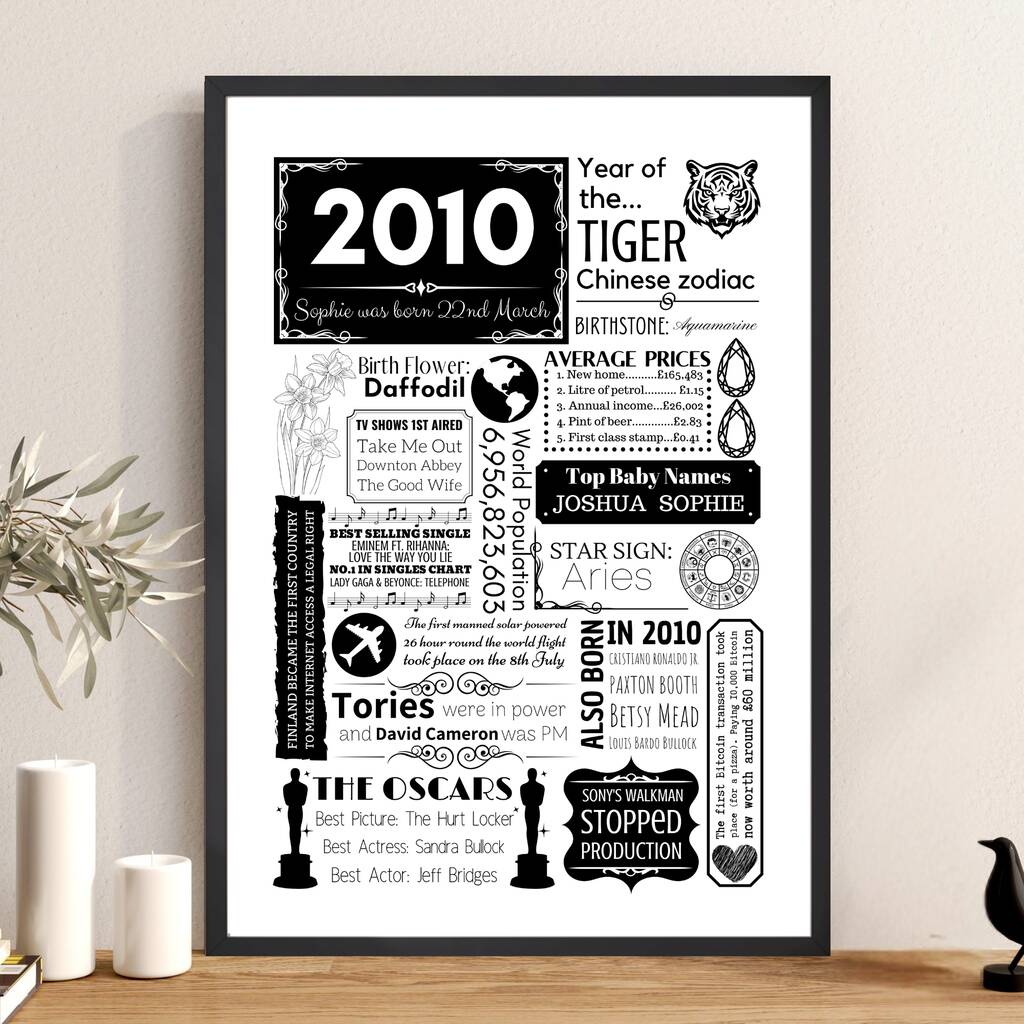 This personalised print provides fun facts from 2010, including the world population, Oscar winners, TV debuts, famous births, birth stone and birth flower as well as plenty of other fun and interesting facts that will keep everyone entertained.