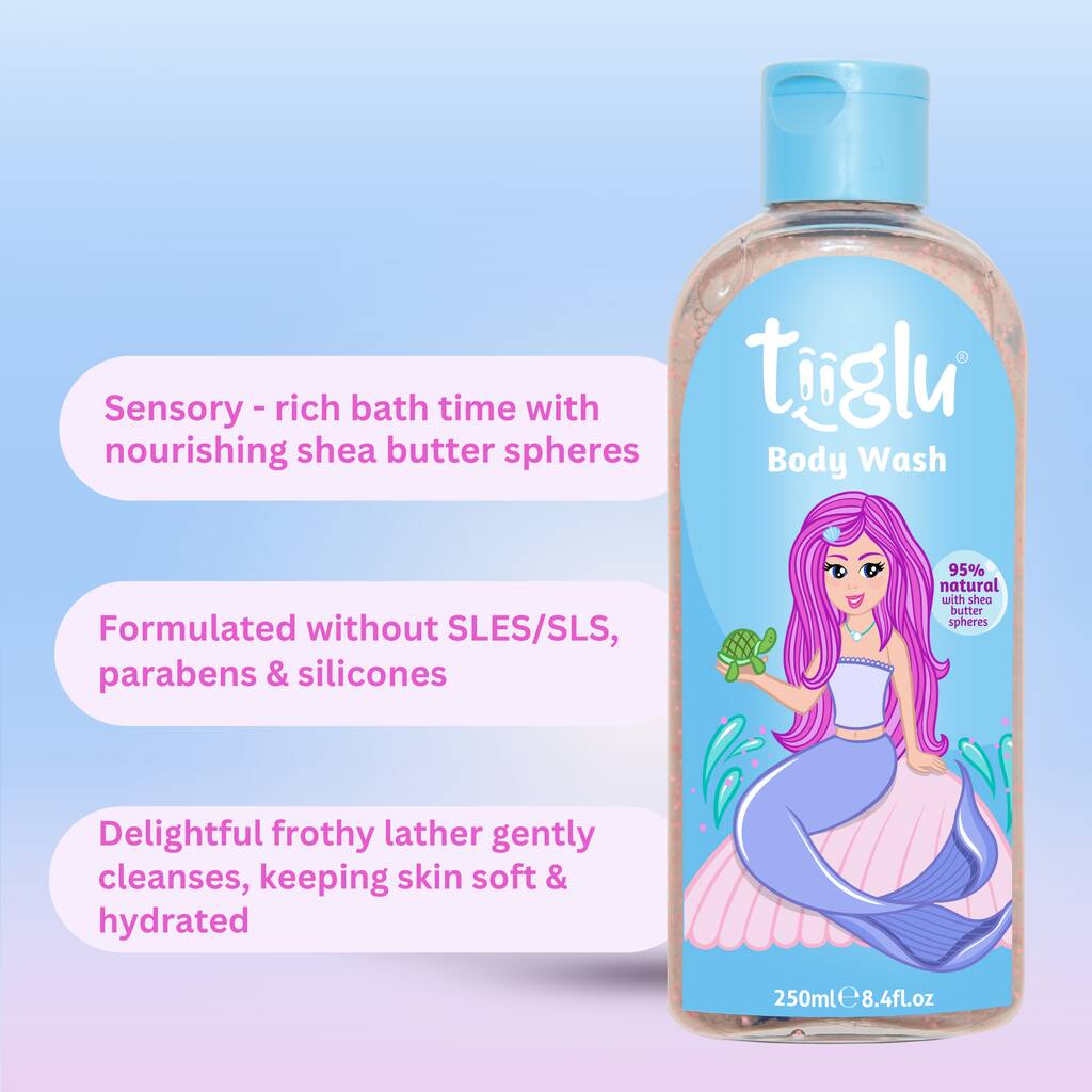 Bathe in a sea of softness and delight with our Mermaid Body Wash, infused with a blend of seven luscious fruit extracts. This gentle formula creates a sensory-rich, frothy lather, with nourishing shea butter spheres melting onto mermaid skin. Cleanses, while keeping delicate skin soft and hydrated.