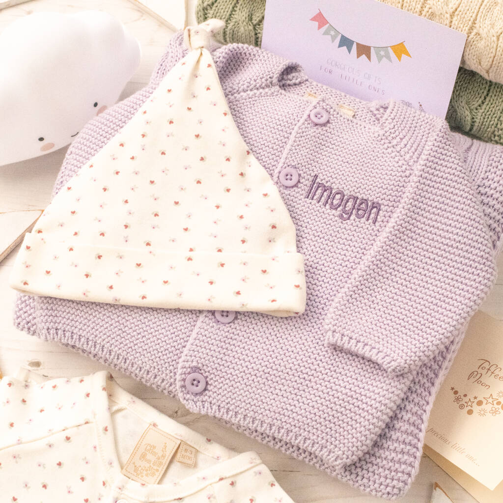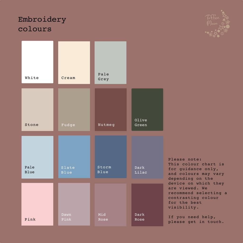 If you would like to make this gift set even cosier, we offer a range of coordinating knitted Bubble Cardigans for £25 with the option to personalise with an embroidered name on the chest in a wide range of embroidery colours for an additional £10 charge. Choose neutral or colourful embroidery from our selection.