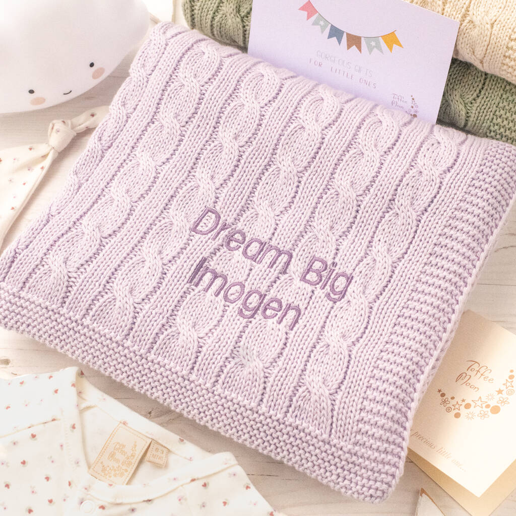 A beautiful cosy cable knitted baby girls blanket in luxury cotton with the option to add an embroidered name and date for the perfect keepsake.