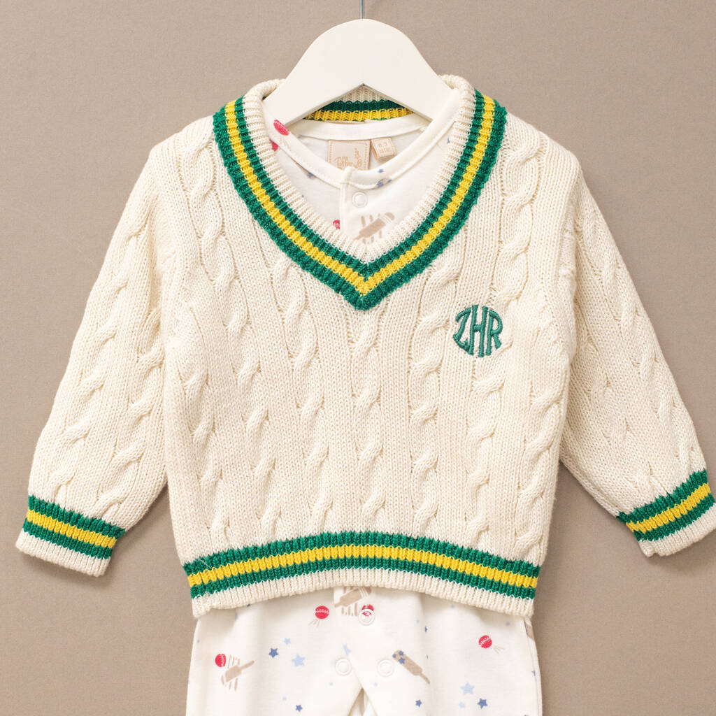 If you would like to make this gift set even cosier, we offer a range of coordinating knitted Cricket Jumpers with the option to personalise with an embroidered monogram on the chest in a wide range of embroidery colours for an additional £10 charge. Please double-check personalisation details (and sizes) as returns aren't accepted on custom items.