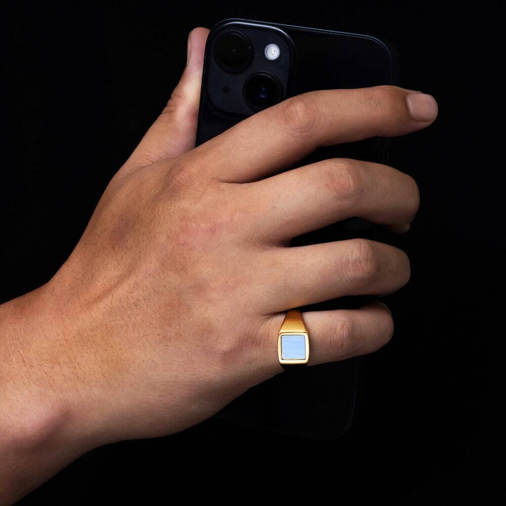 The 18k Gold Blue Lace Square Signet Ring! The latest square signet. A light blue gemstone with streaks of white through the gem.
