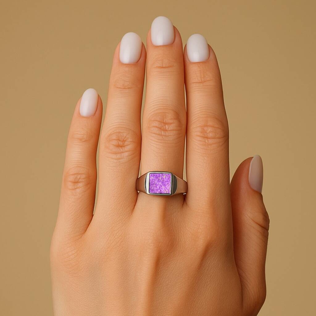 A Purple Sugilite gemstone ring cased in a Gold square signet.
