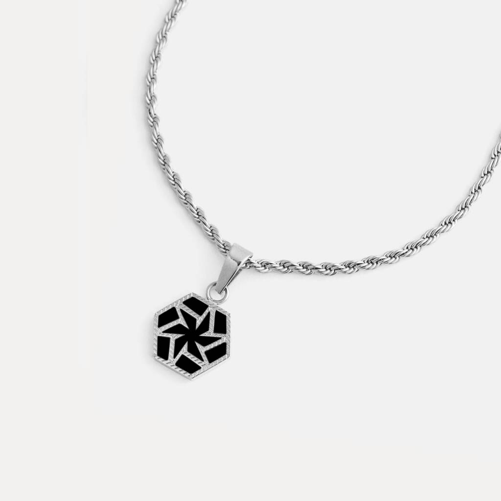 The Emblem Pendant - Black. Featuring our signature logo set within a hexagonal frame.