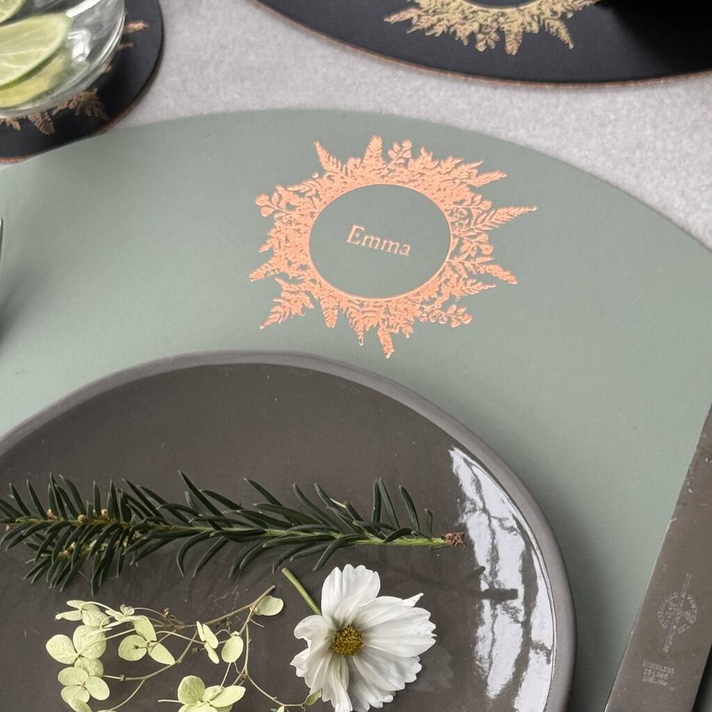 Two Personalised Leather Placemat With Antique Flower Fern Wreath Motif Option To Add More