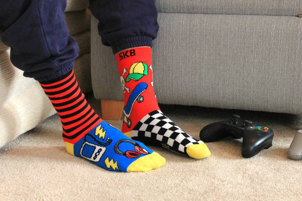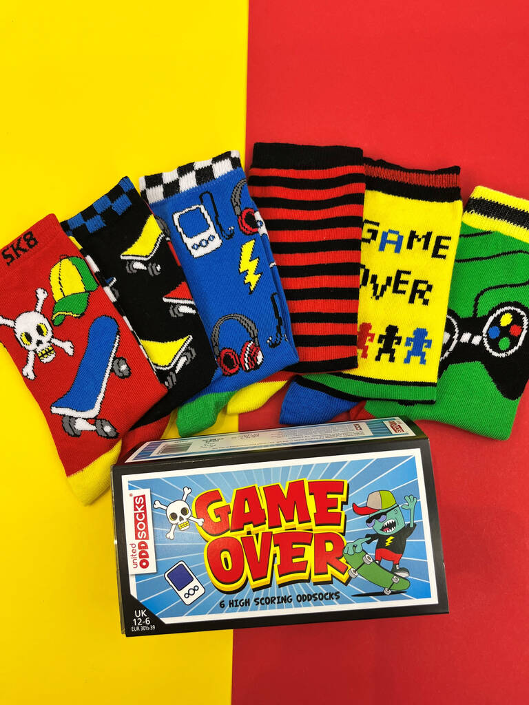 Level Up Your Sock Game: Get ready for the ultimate mash-up of gaming and skating with this box of six "high scoring" individual socks! Make mornings easier and more fun for everyone! With six individual socks that are designed to be mismatched, you can say goodbye to the hassle of hunting for a matching pair. This not only saves parents time and stress but also gives kids a super cool way to express their creativity and unique style, combining their favourite hobbies in a fun, fashionable way.