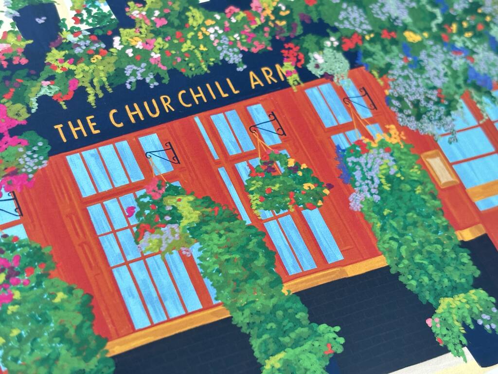 A Giclee illustration print featuring the beautiful Churchill Arms pub in Kensington, West London.