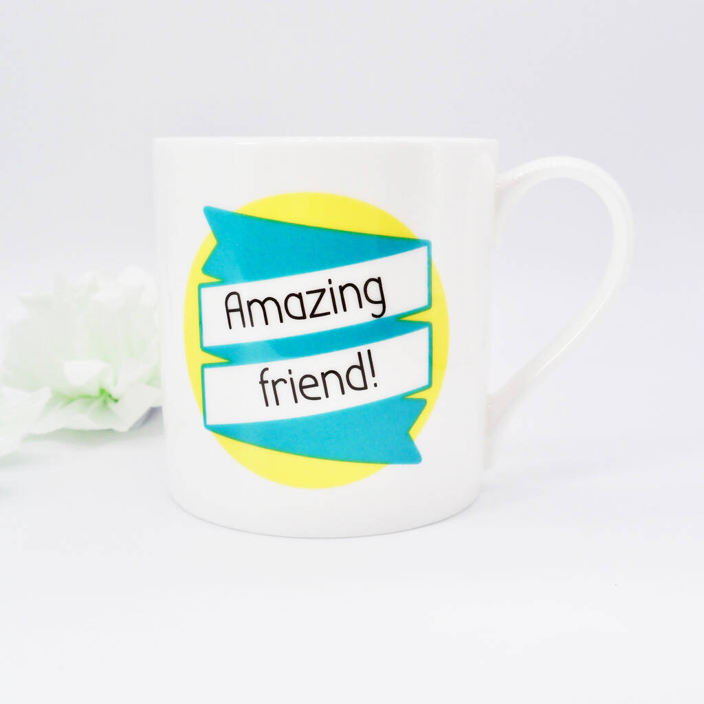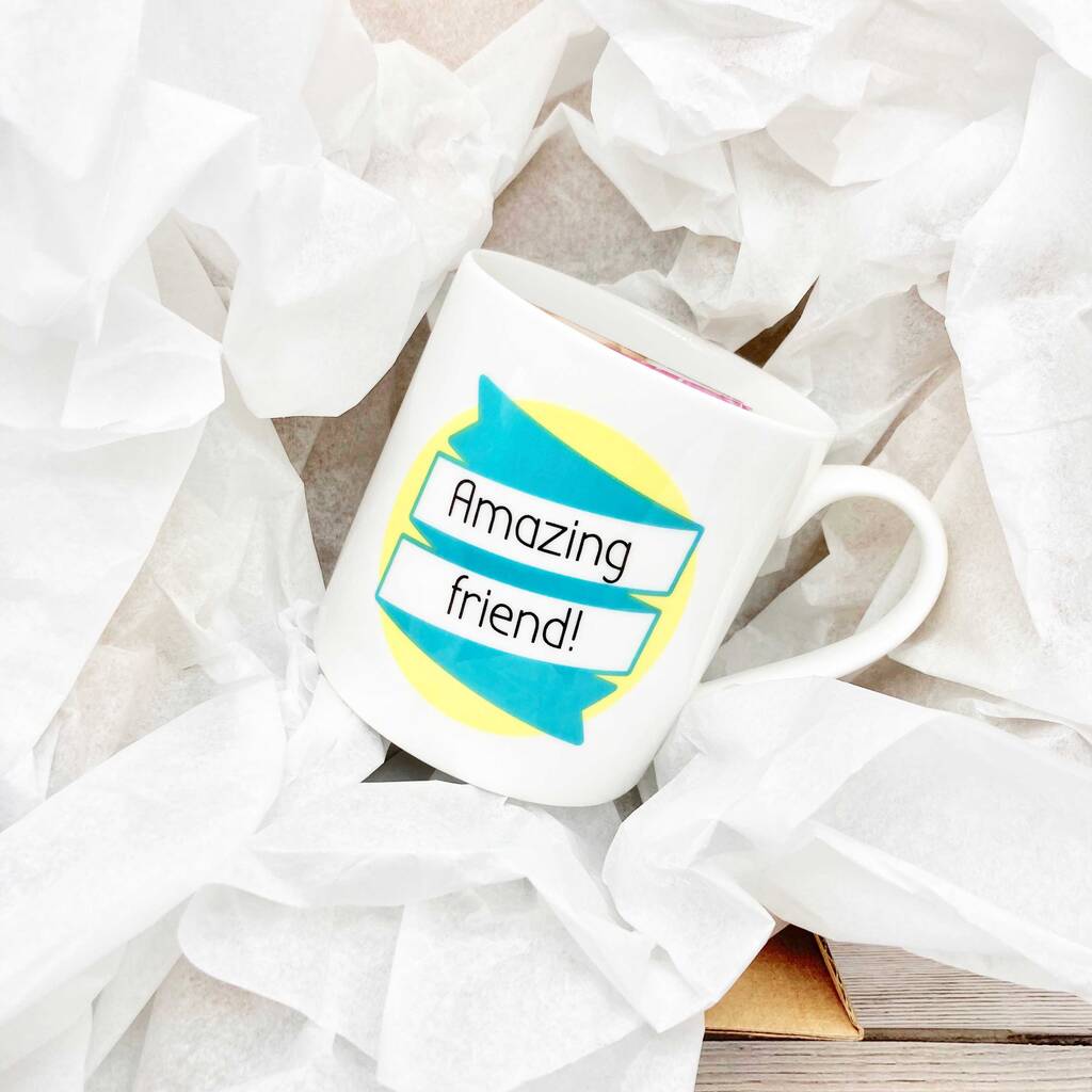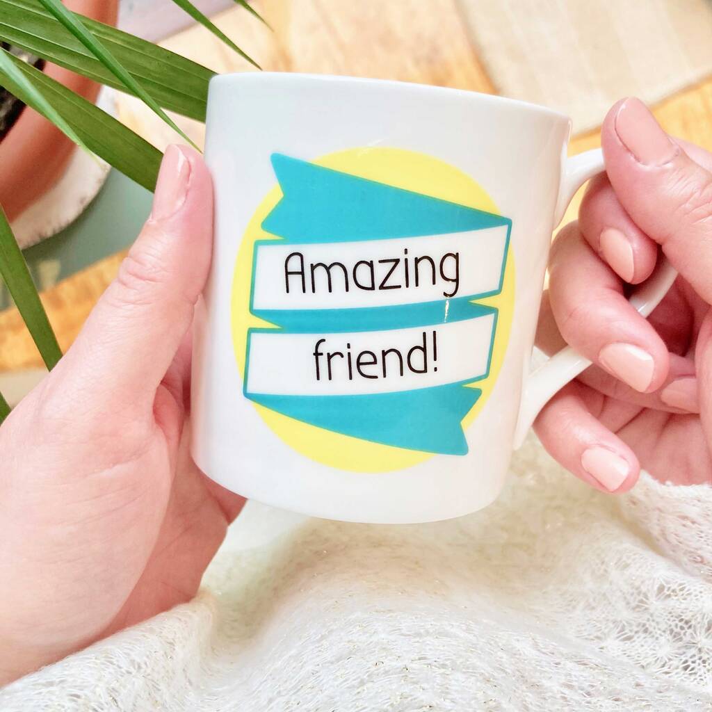 Beautifully printed in the UK, this bright and cheerful bone china mug features the uplifting words “Amazing Friend” on the front and “A Hug in a Cup” on the reverse — the perfect reminder of just how loved and appreciated they are. Whether it’s to celebrate a birthday, say thank you, or simply to let them know you’re thinking of them, this will make each cup of tea or coffee a little 'Hug in a Mug' just from you.