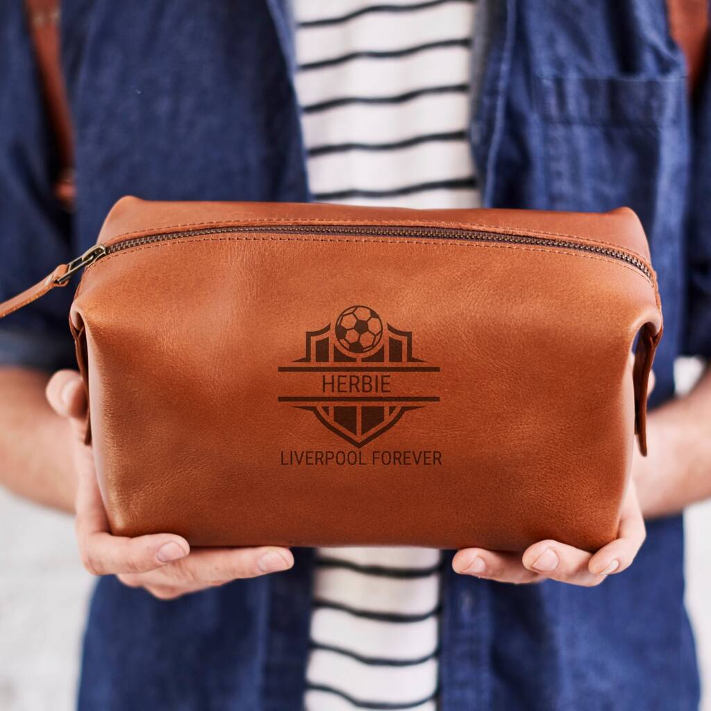 Our new engraved football stamp looks great on this leather wash bag. Handmade combining beautiful leather and vintage-inspired design -the ultimate gift for football fans!