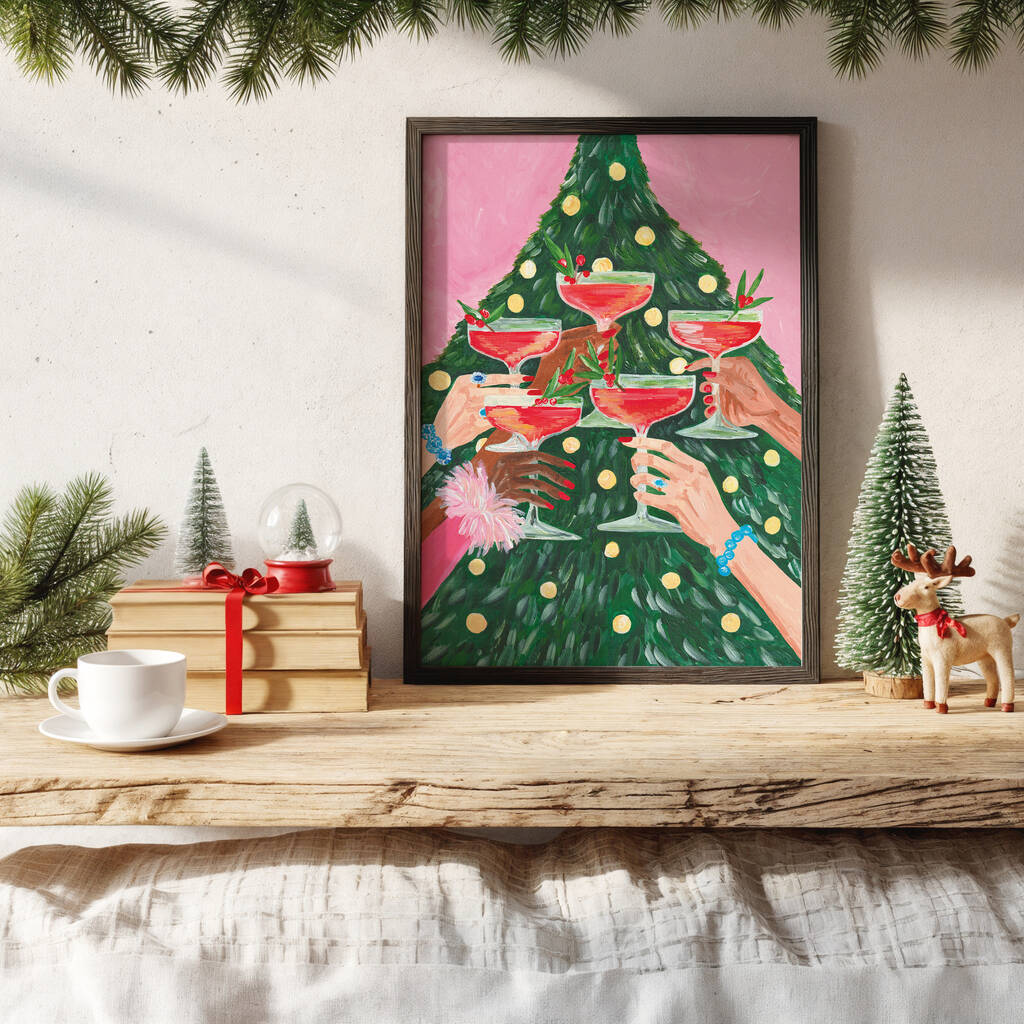 Cheers By The Tree Christmas Art Print – Festive Celebration Wall Art