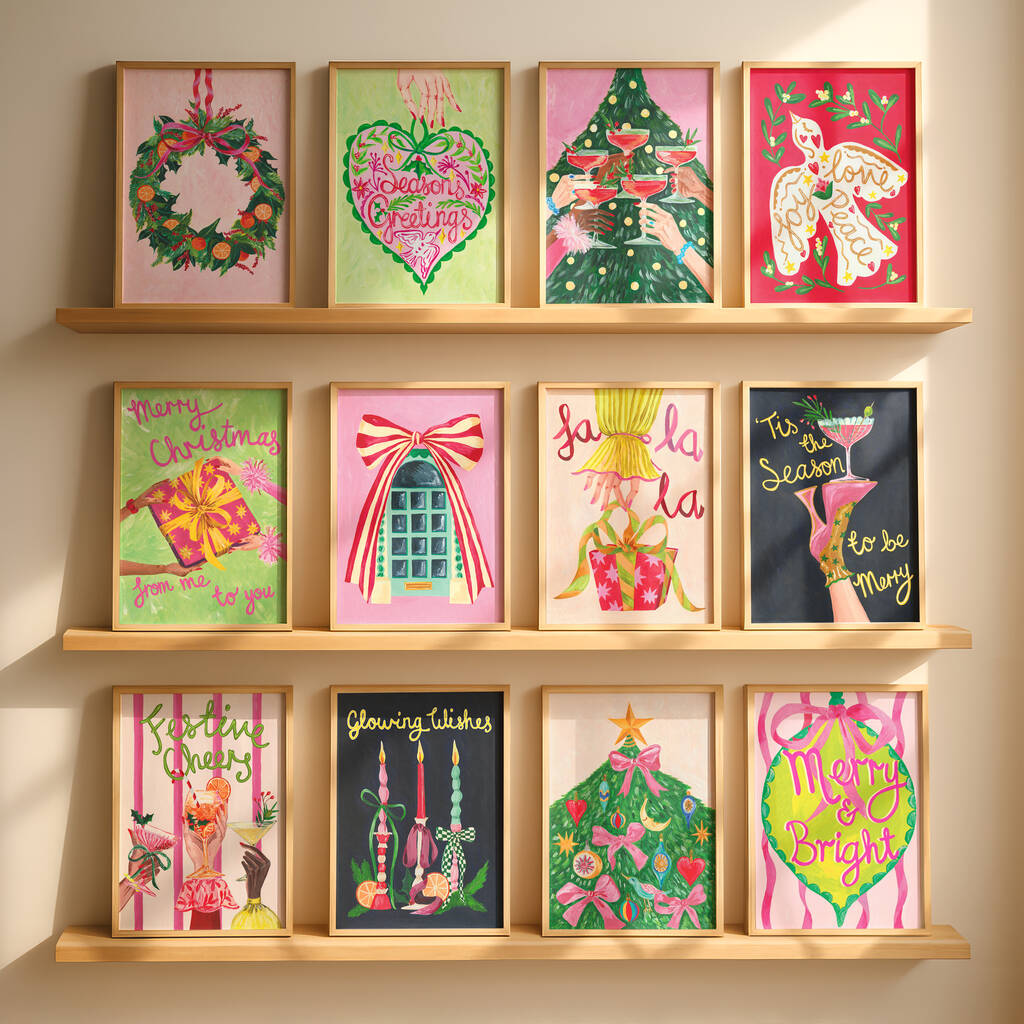 Each artwork celebrates the magic of the season, from sparkling wreaths and Christmas trees to playful gift and cocktail scenes. Choose your favourite pair, or collect the full set of 12 to create a beautiful festive gallery wall.