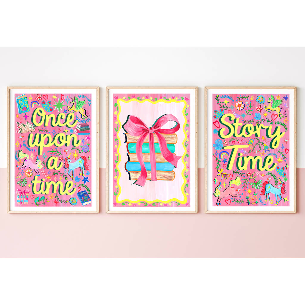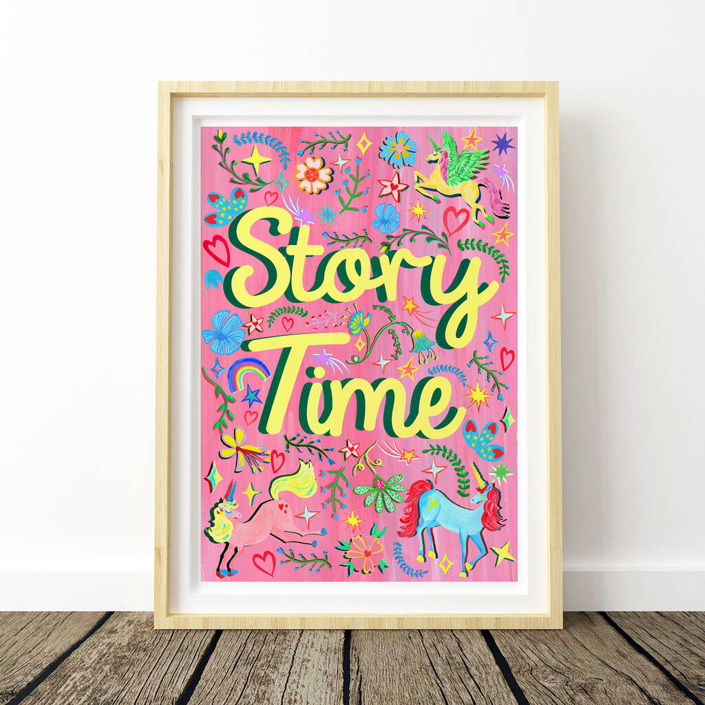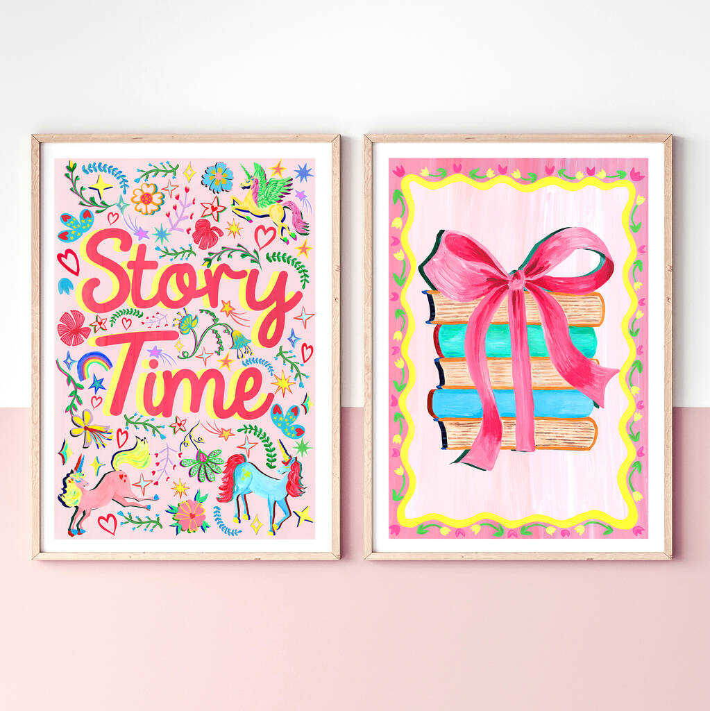 Pink Story Time Print, Reading Nook Illustration, Girls Room Wall Art