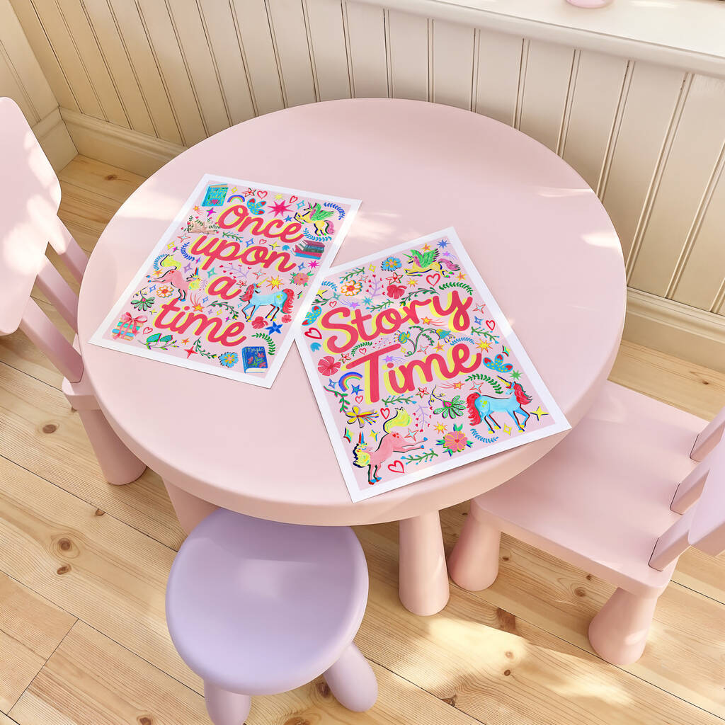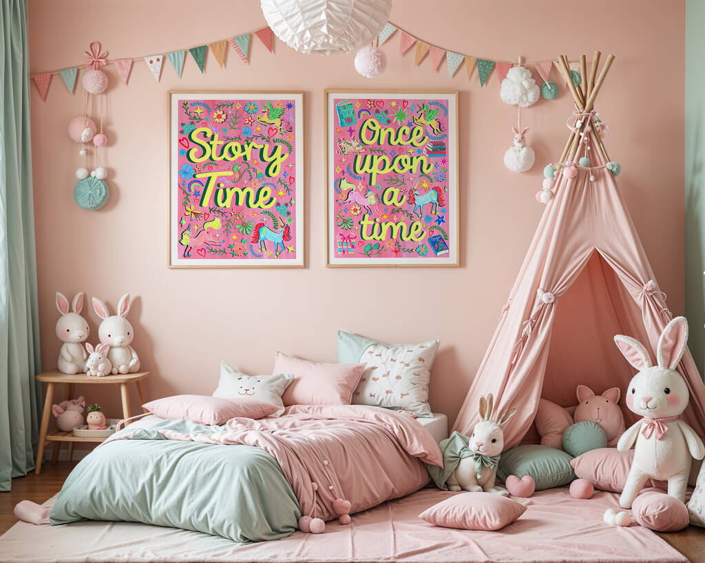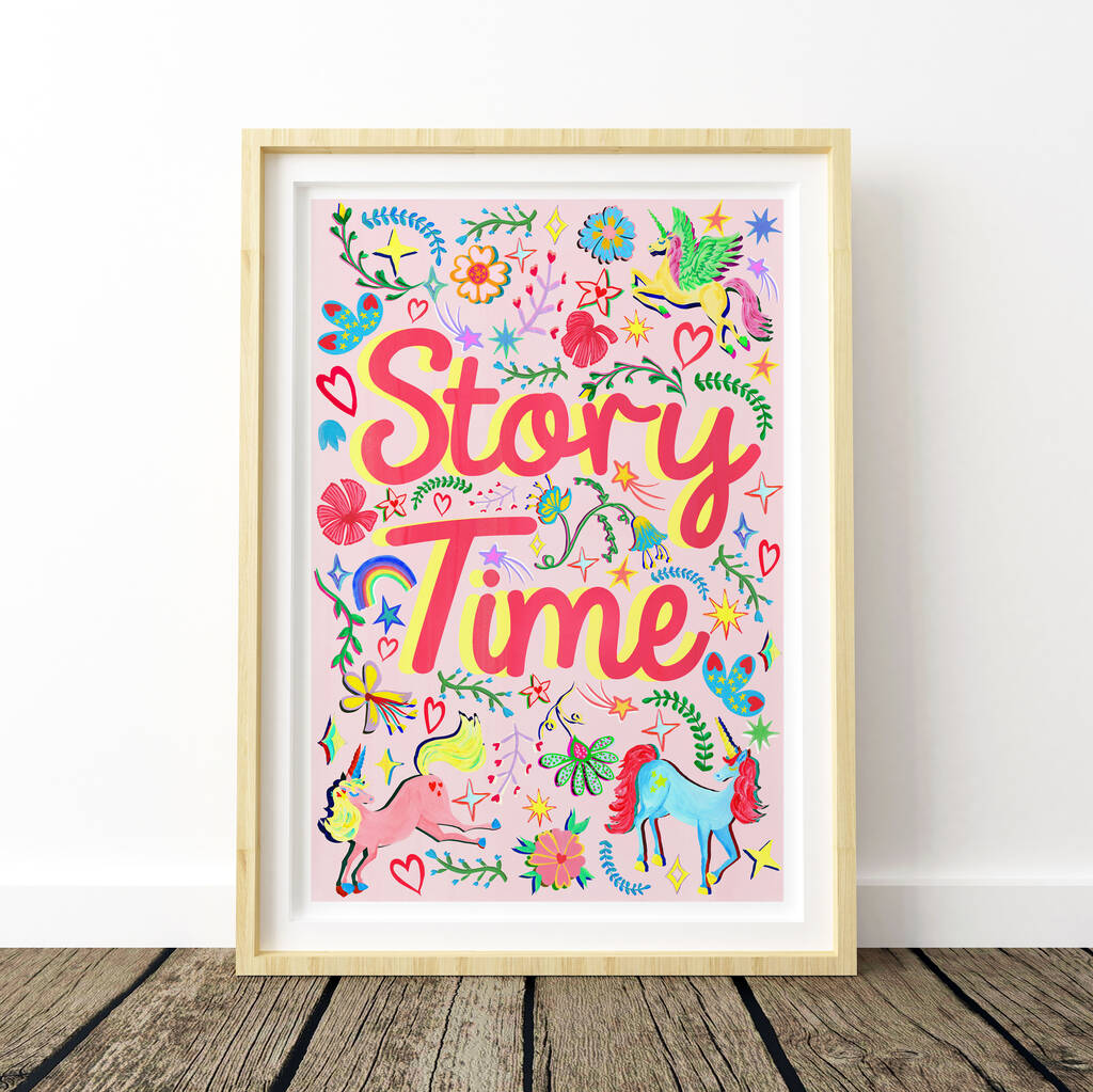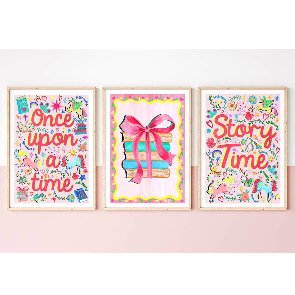 Pink Story Time Print, Reading Nook Illustration, Girls Room Wall Art