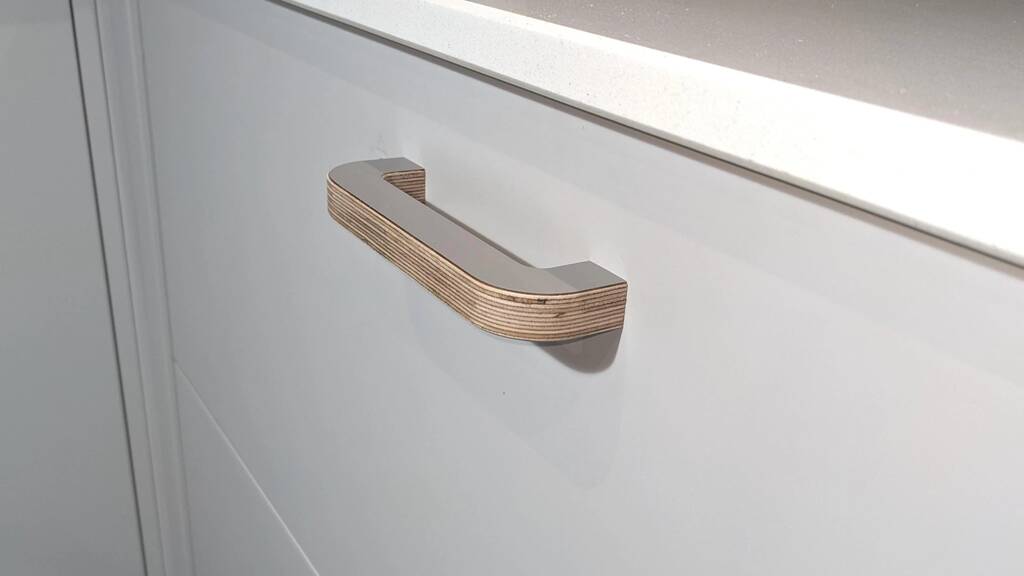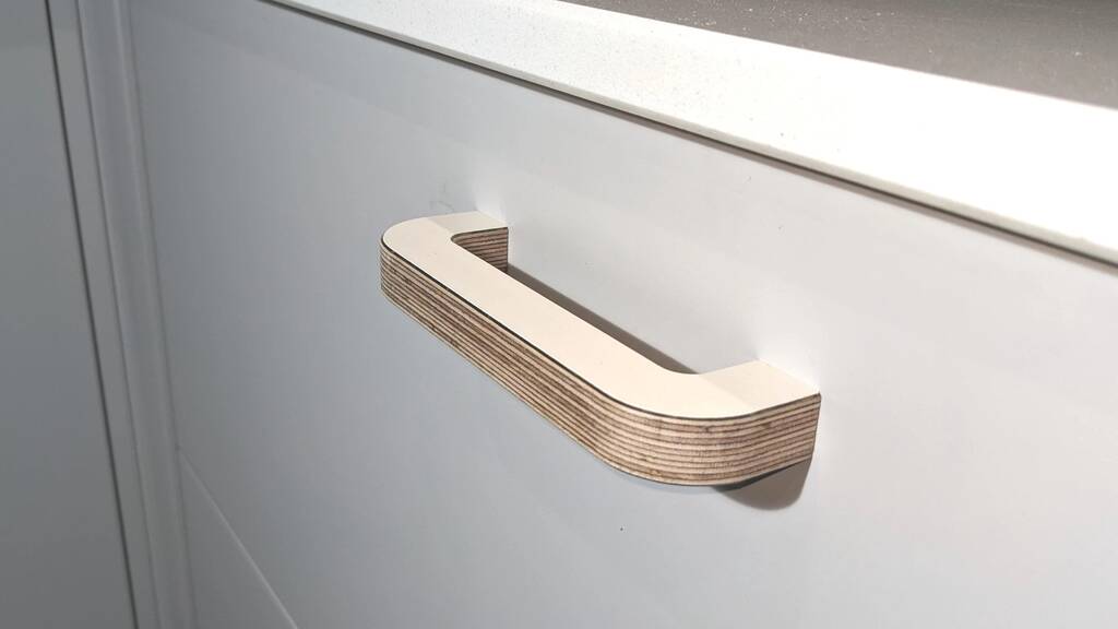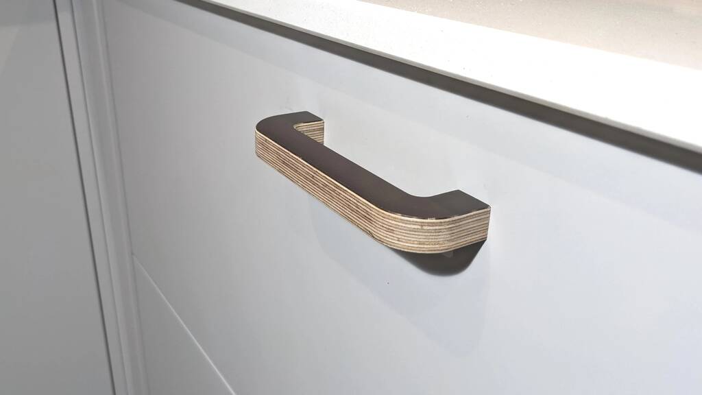 Door and drawer pull handle made from 15mm Birch plywood Laminated with Formica and finished with a hard wearing Hardwax Oil.