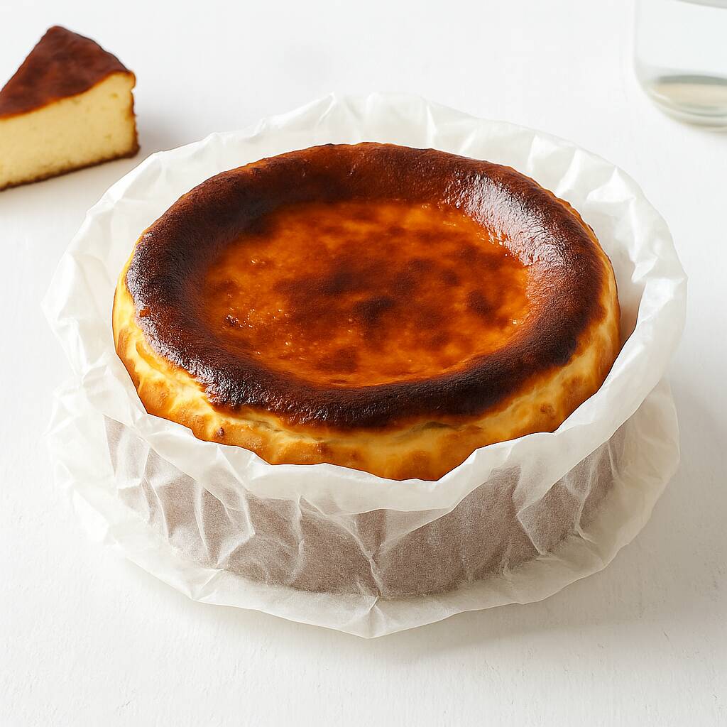 The Burnt Basque Cheesecake is a crustless, creamy dessert with a caramelised top and soft center, a rustic yet indulgent treat from Spain’s Basque regionDiscover the magic of our Burnt Basque Cheesecake, a gluten-free delight that breaks all the rules of traditional baking, featuring a beautifully caramelised, almost burnt exterior that contrasts perfectly with its creamy, custard-like center. The edges are firm and slightly smoky, while the center melts in your mouth, offering a one-of-a-kind texture that's both rustic and luxurious.