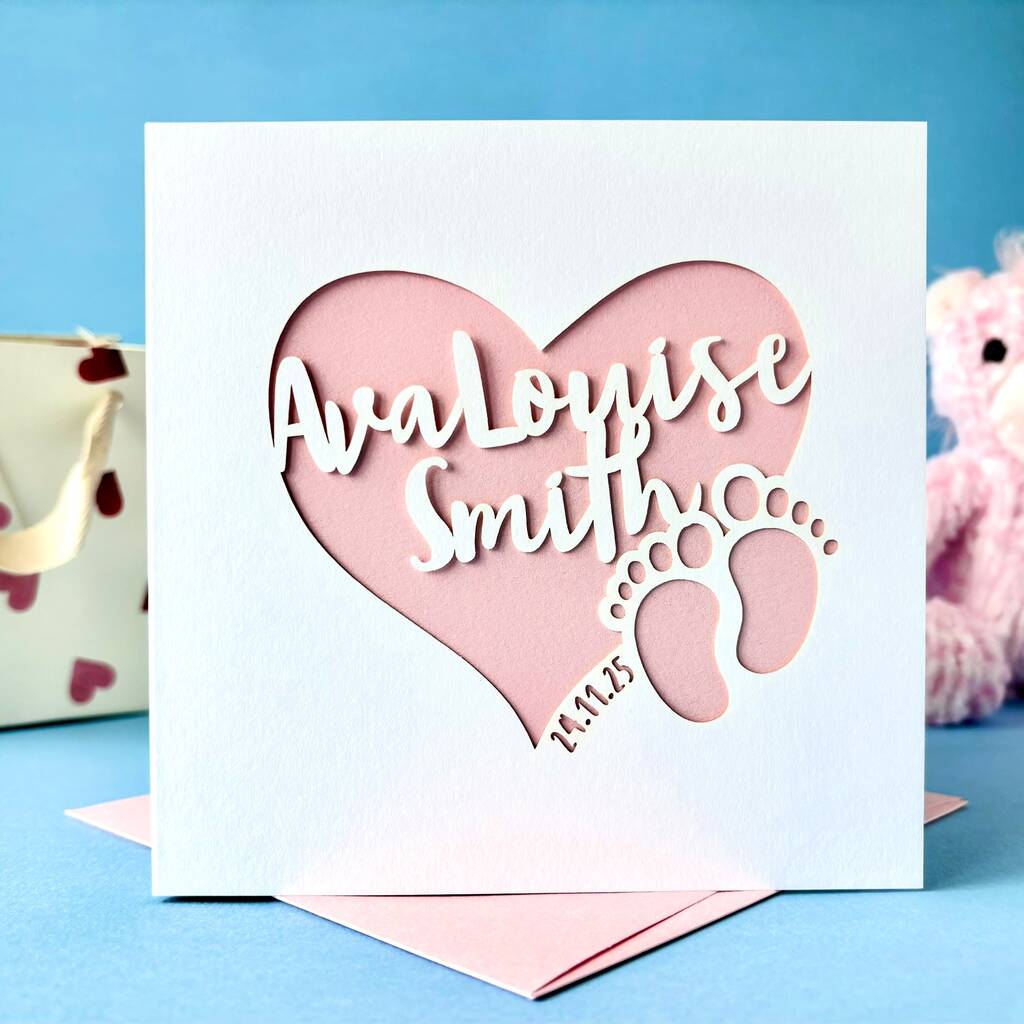 This stylish papercut new baby card is the perfect way to welcome a little one to our world. The card features the outline of a heart shape, with some adorable baby footprints to the side of the heart. Each card is then personalised with your choice of name across the heart, in a beautiful script font, with the addition of the child's date of birth just below the feet, if you choose. The card is simple and timeless, and will be kept as a keepsake for years to come. Each card is cut on a smooth white sustainable card, with a luxury paper insert in your choice of colours, and is finished by hand.