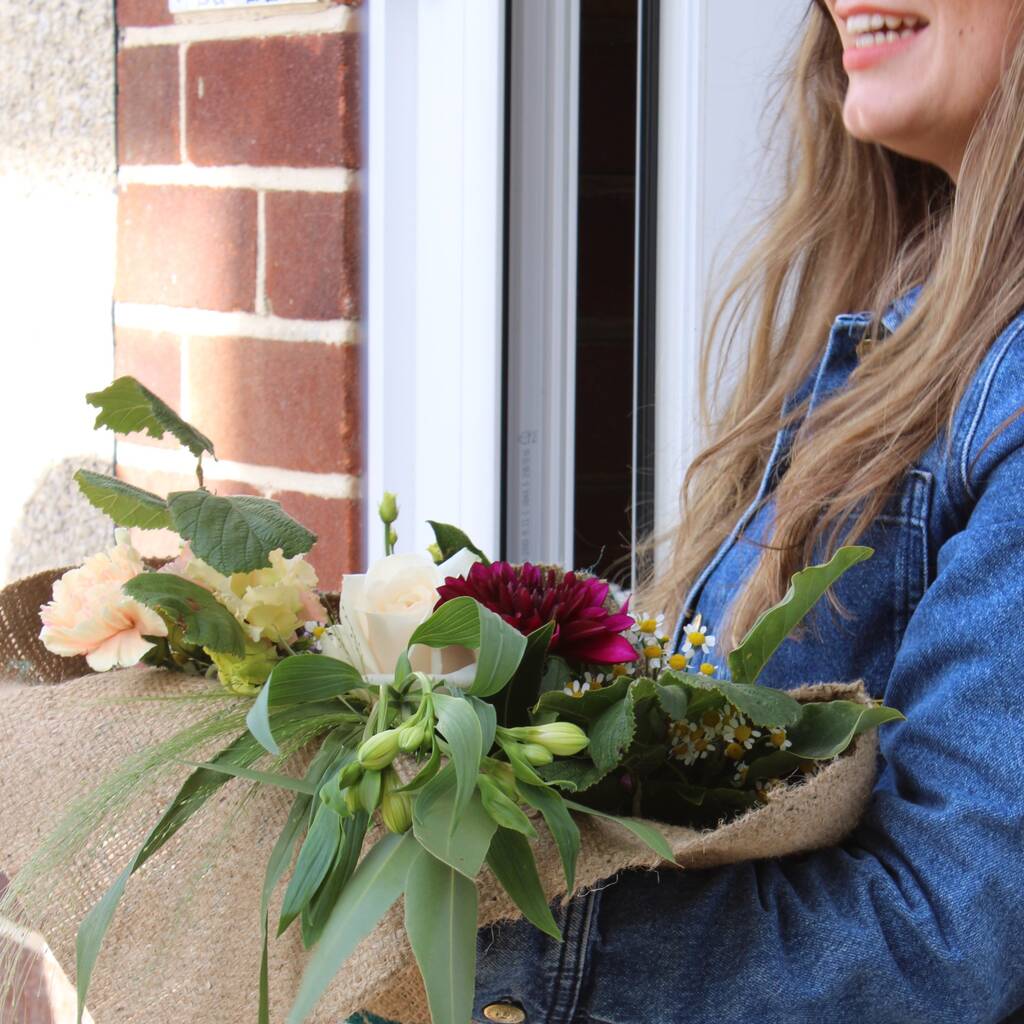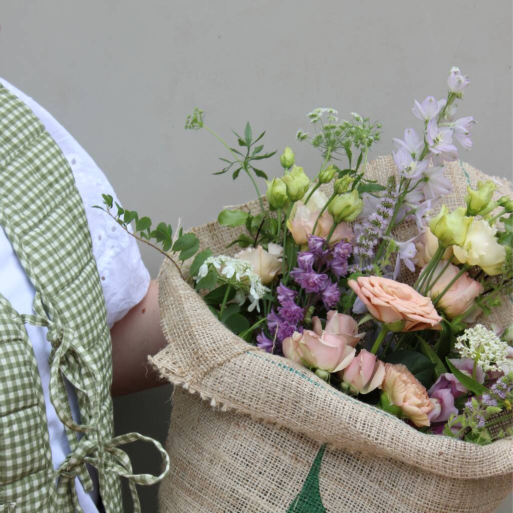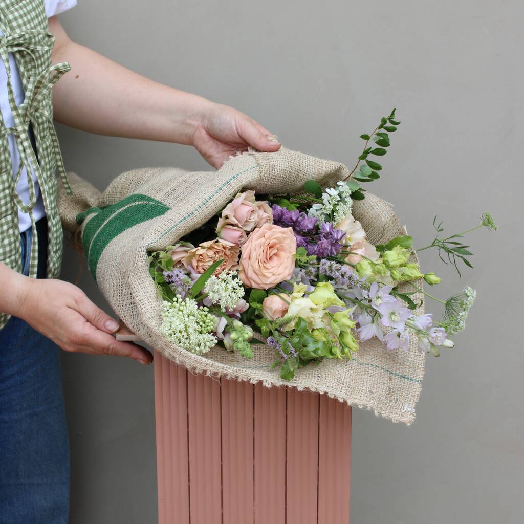 This bouquet features a delightful mix of seasonal flower stems, carefully selected from our daily flower stand. Each stem is arranged and presented in a reused coffee sacking, giving these materials and extra shot of life whilst adding a sustainable touch to your floral gift.