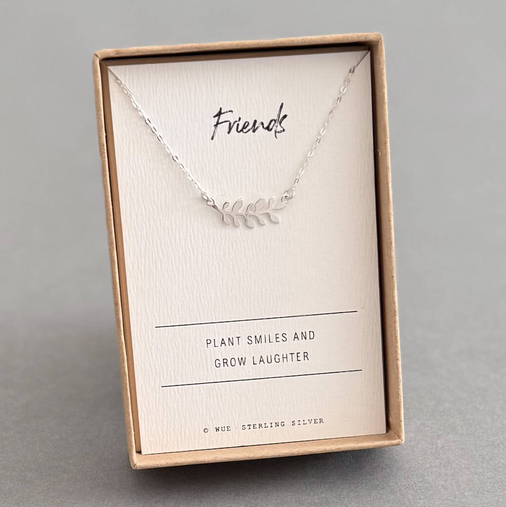 Wue's "Friends plant smiles and grow laughter" sterling silver necklace featuring a leaf celebrates the friendship and special bond between friends. This sweet and delicate necklace is a perfect gift to give thanks to a special friend who always make life a little more hopeful, a lot more joyful and a ton more bearable!