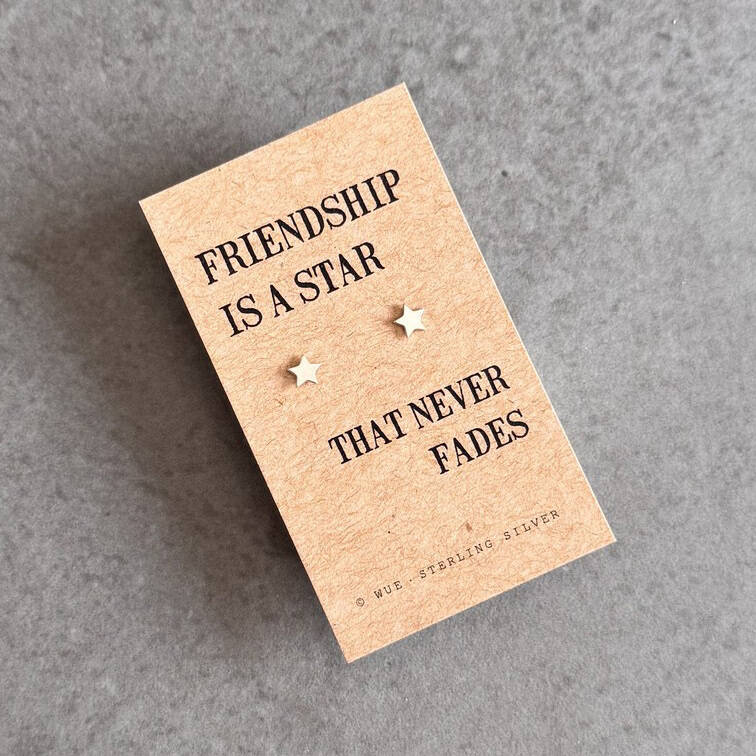 Friendship star sterling silver earrings with a little message card from Wue's token earrings range.