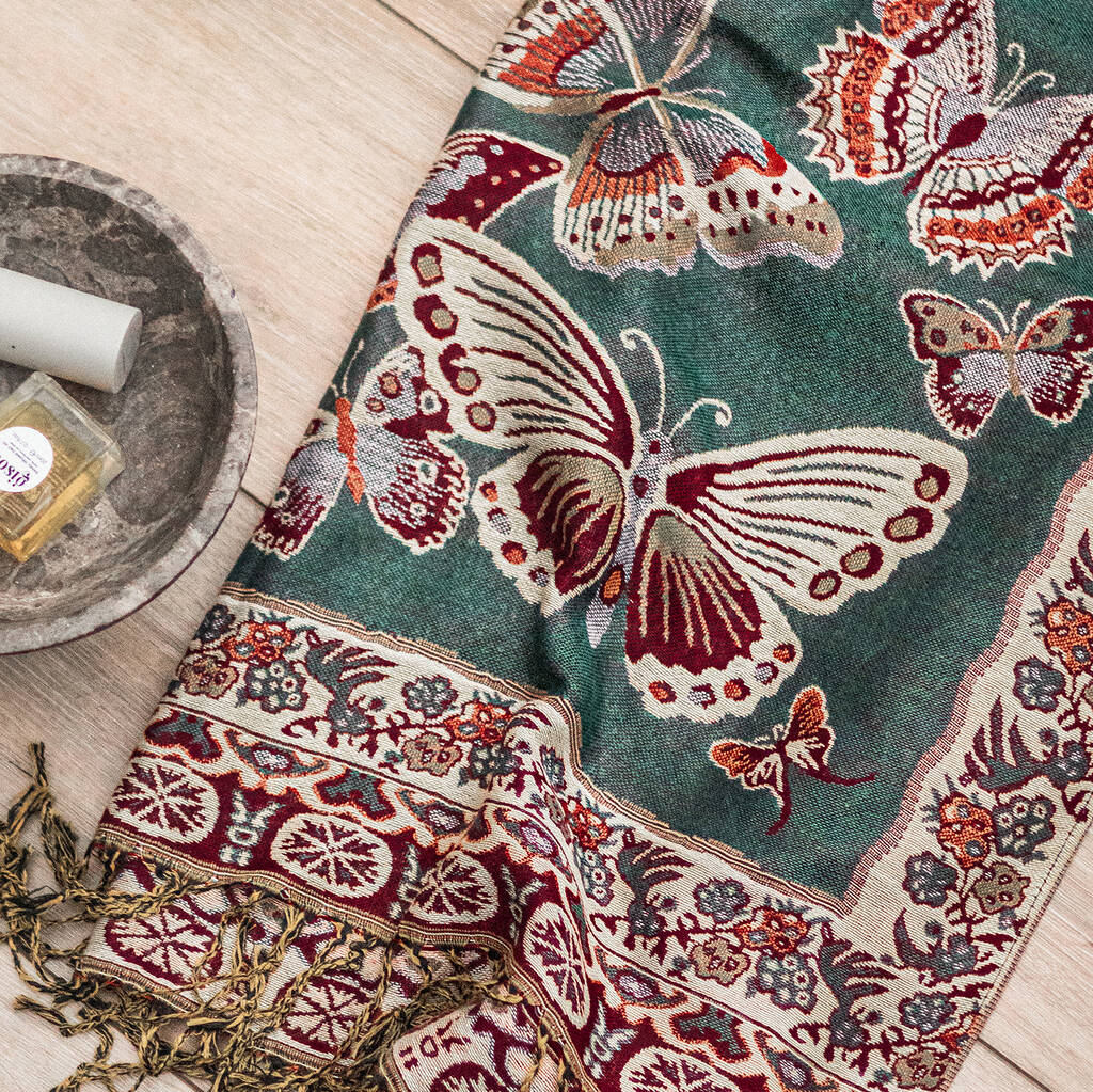 Dark Teal Scatter Butterfly Pashmina With Tassels
